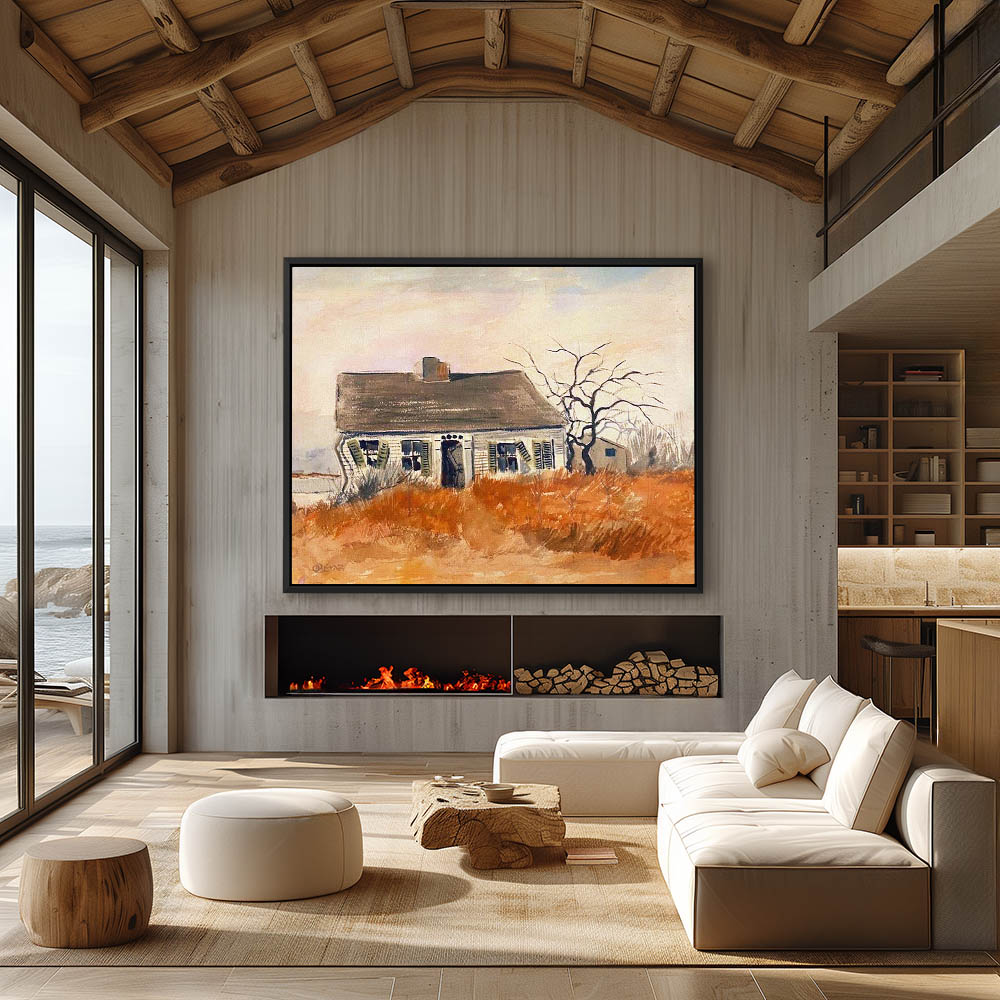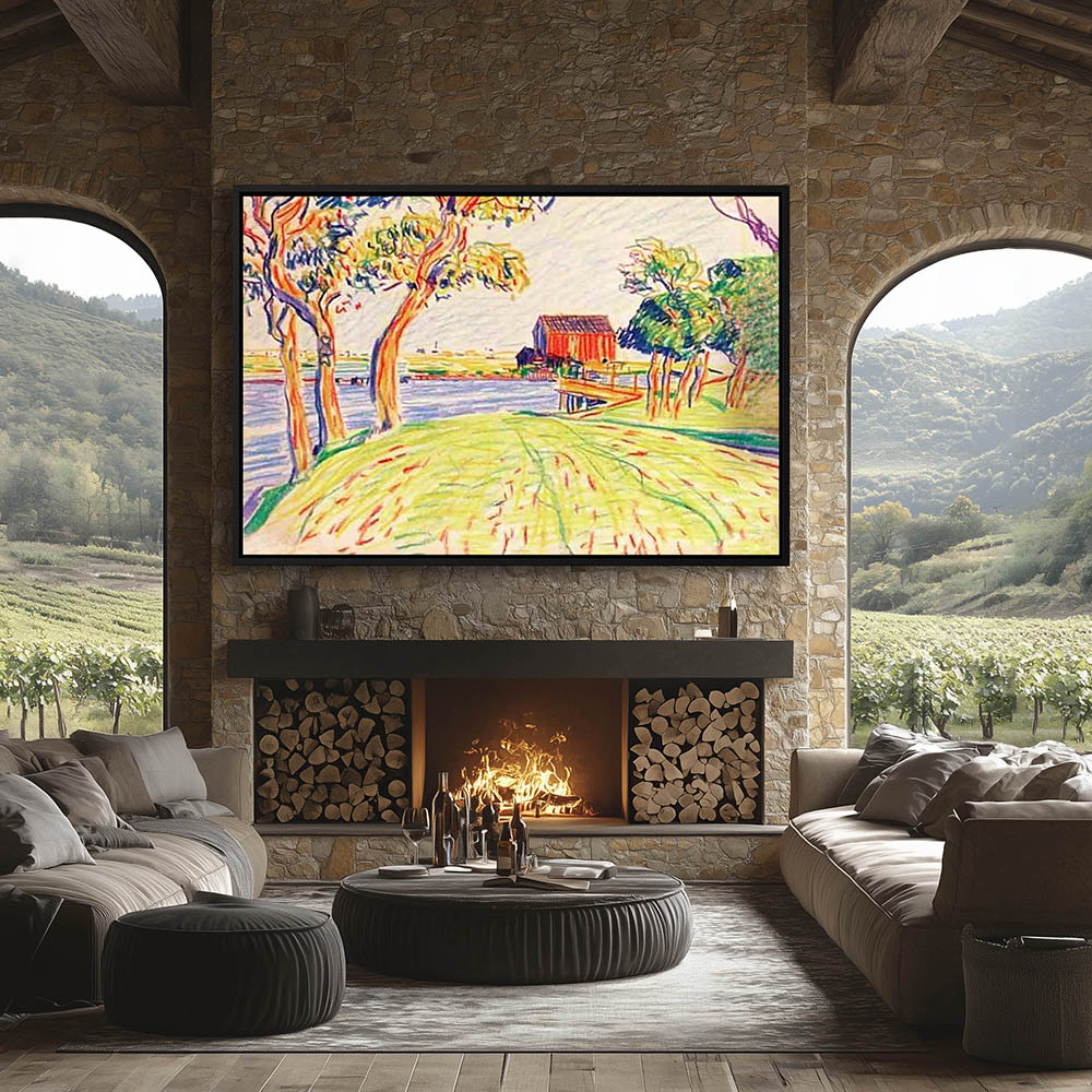 Abstract Landscape Painting with an Old Red Barn next to the River