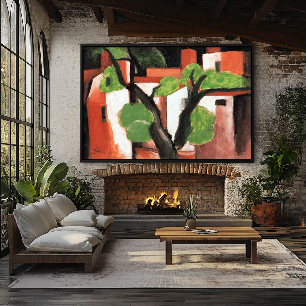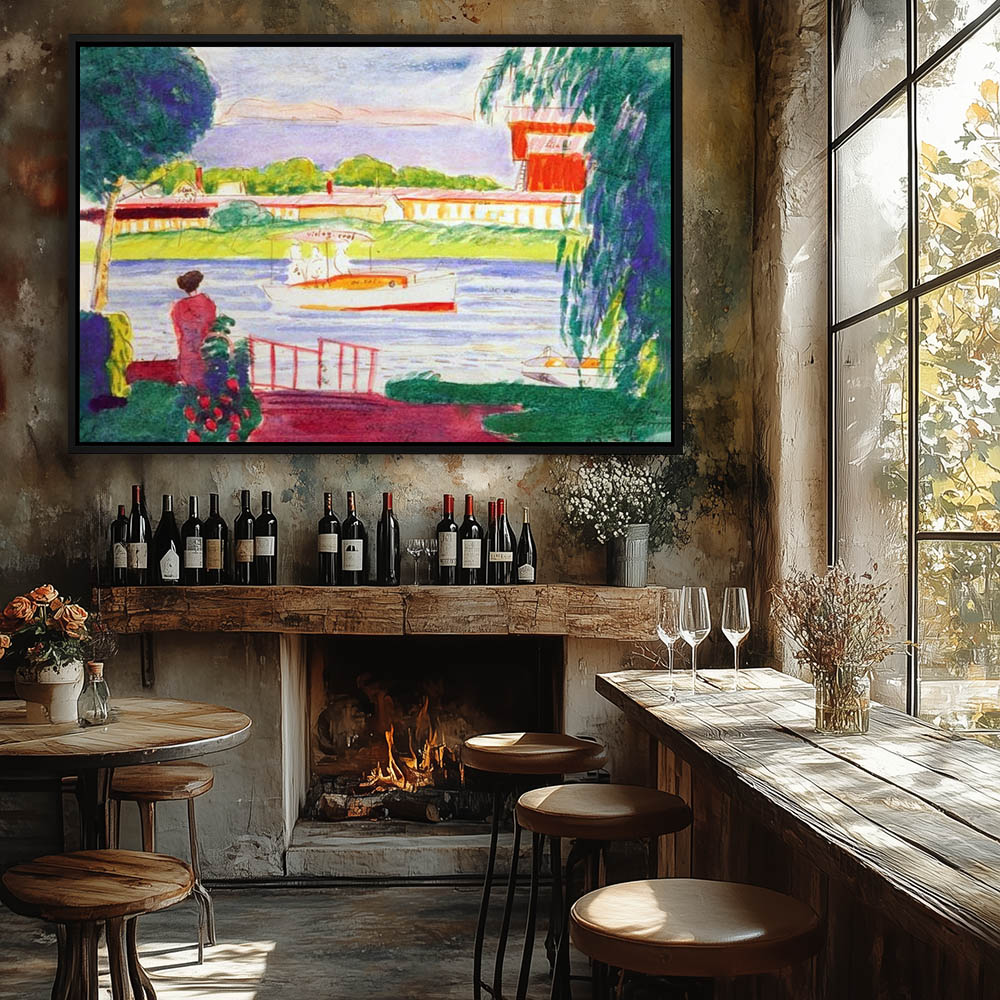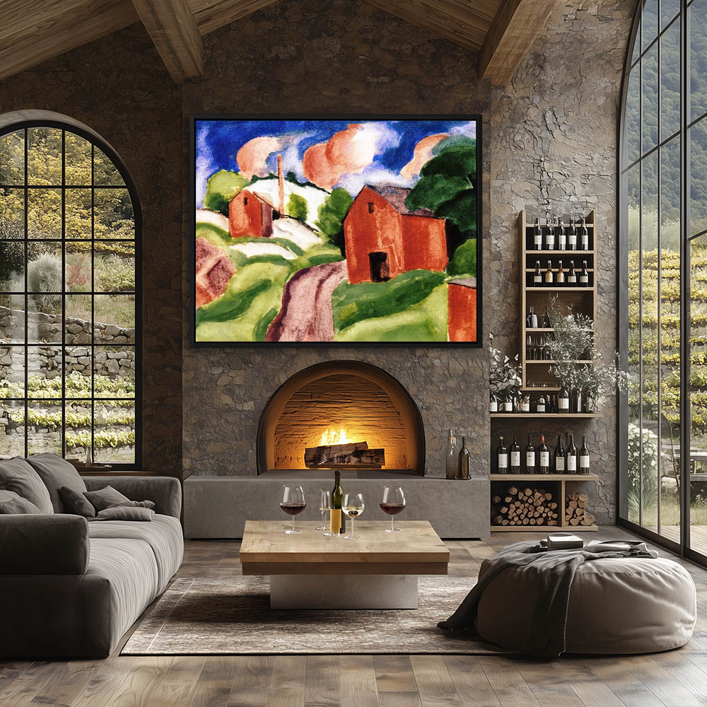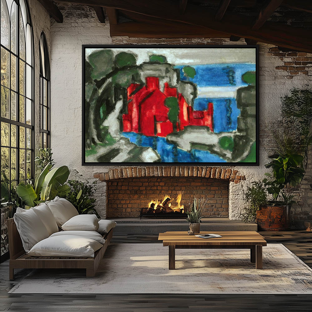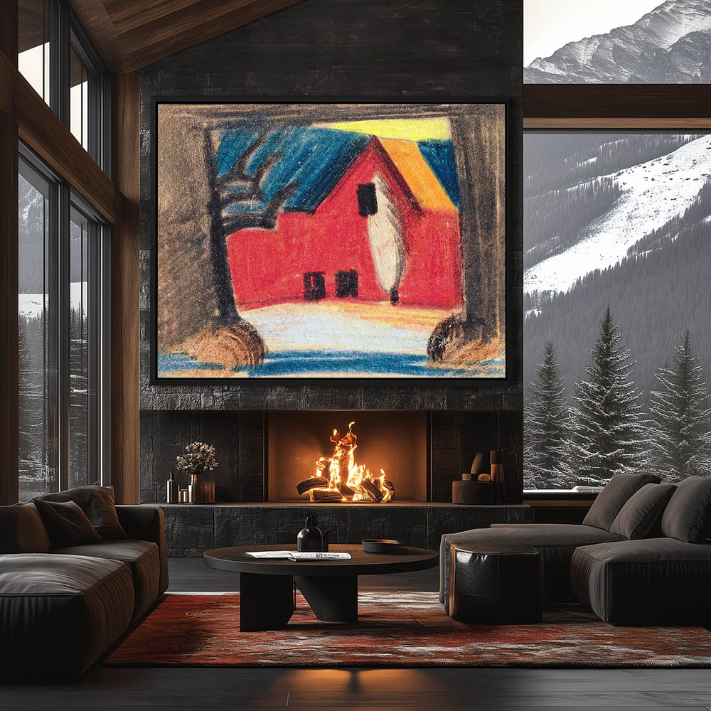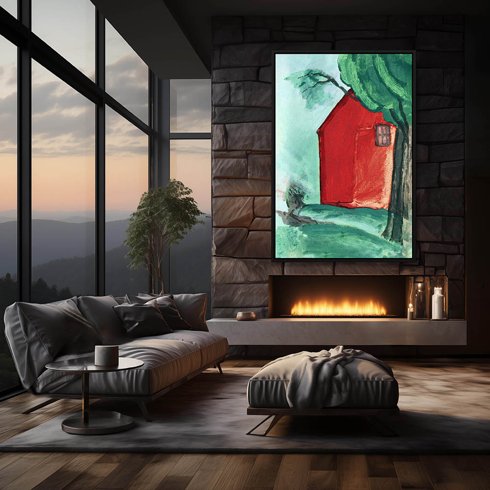Abstract Landscape Painting with a Pond and Red House and Barn
