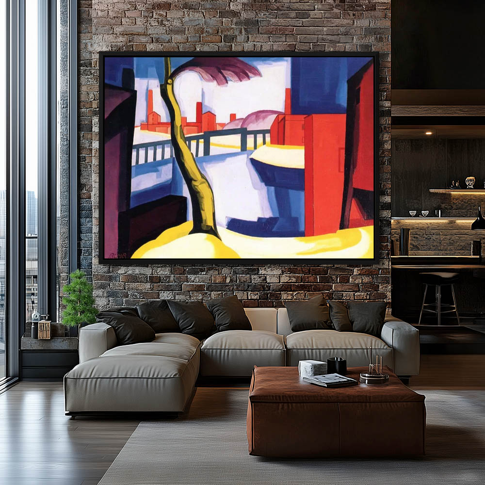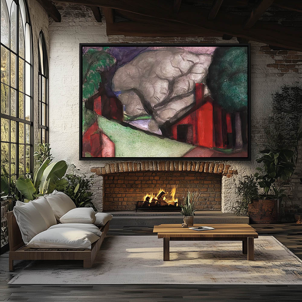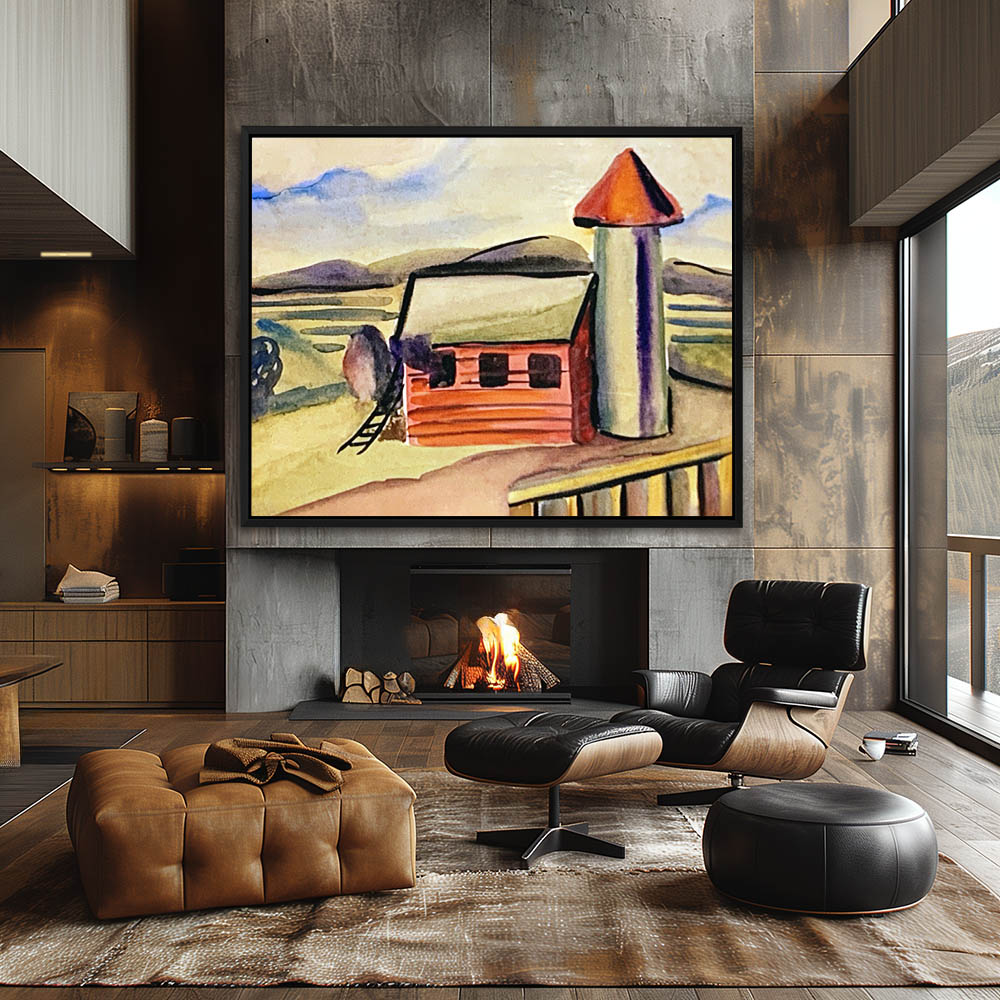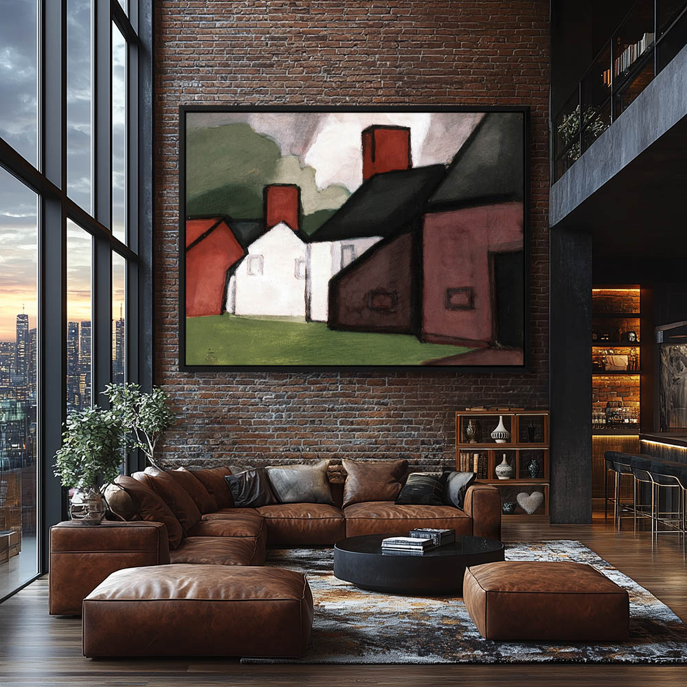 Abstract Landscape Painting of a Farm with a Barn and Grain Silo