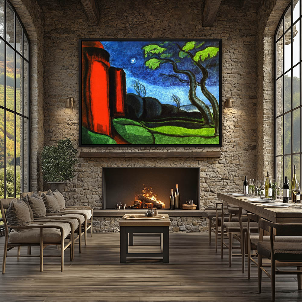 Abstract Landscape Painting with Red House under the Night Sky