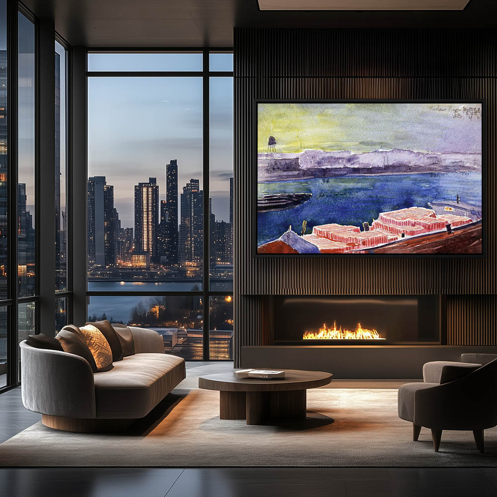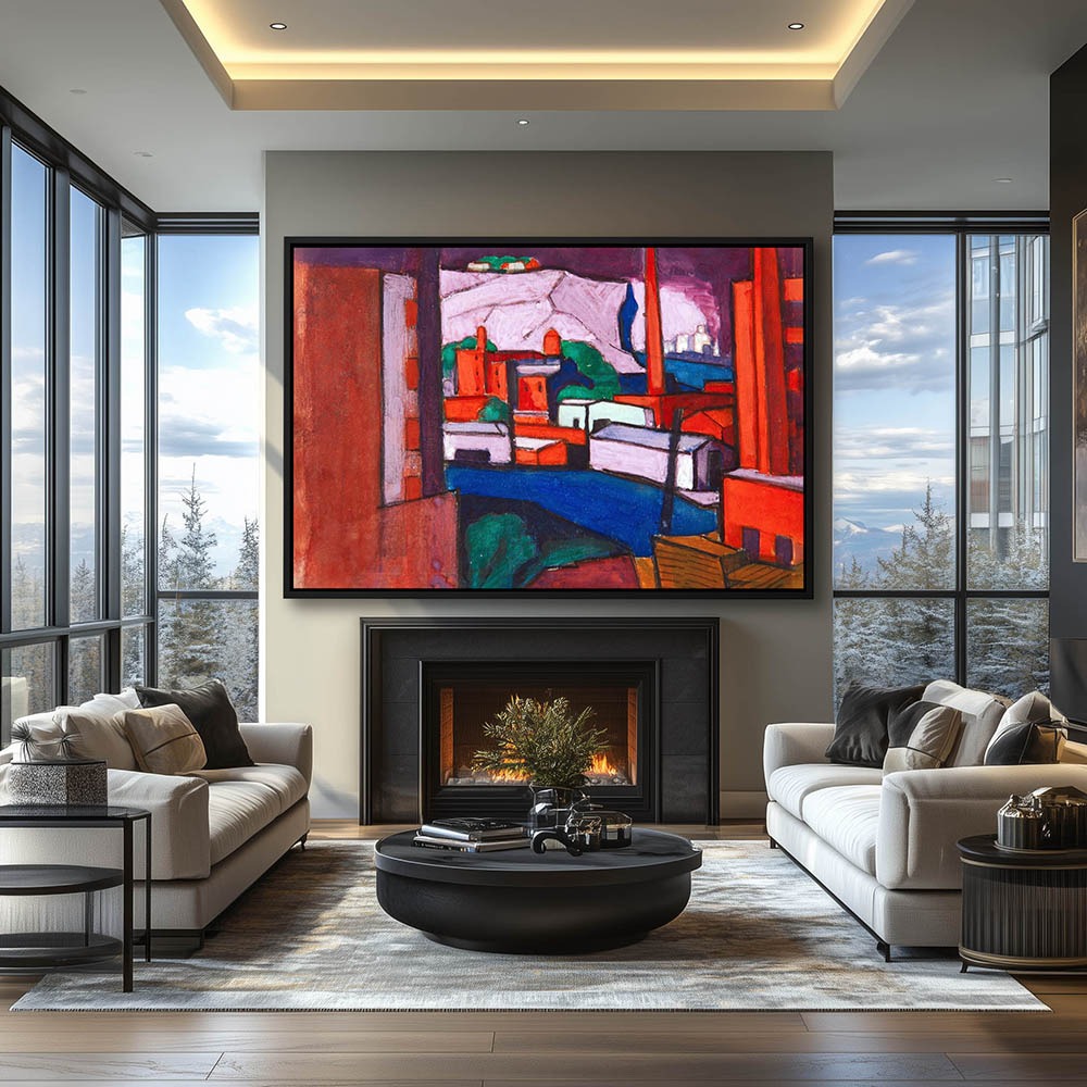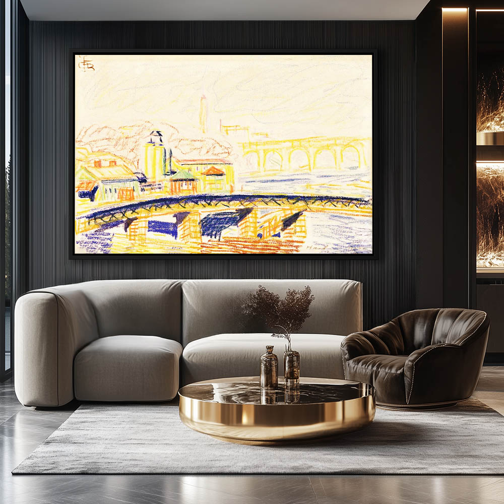 Abstract Landscape Painting with a River A Railroad Bridge and Structures