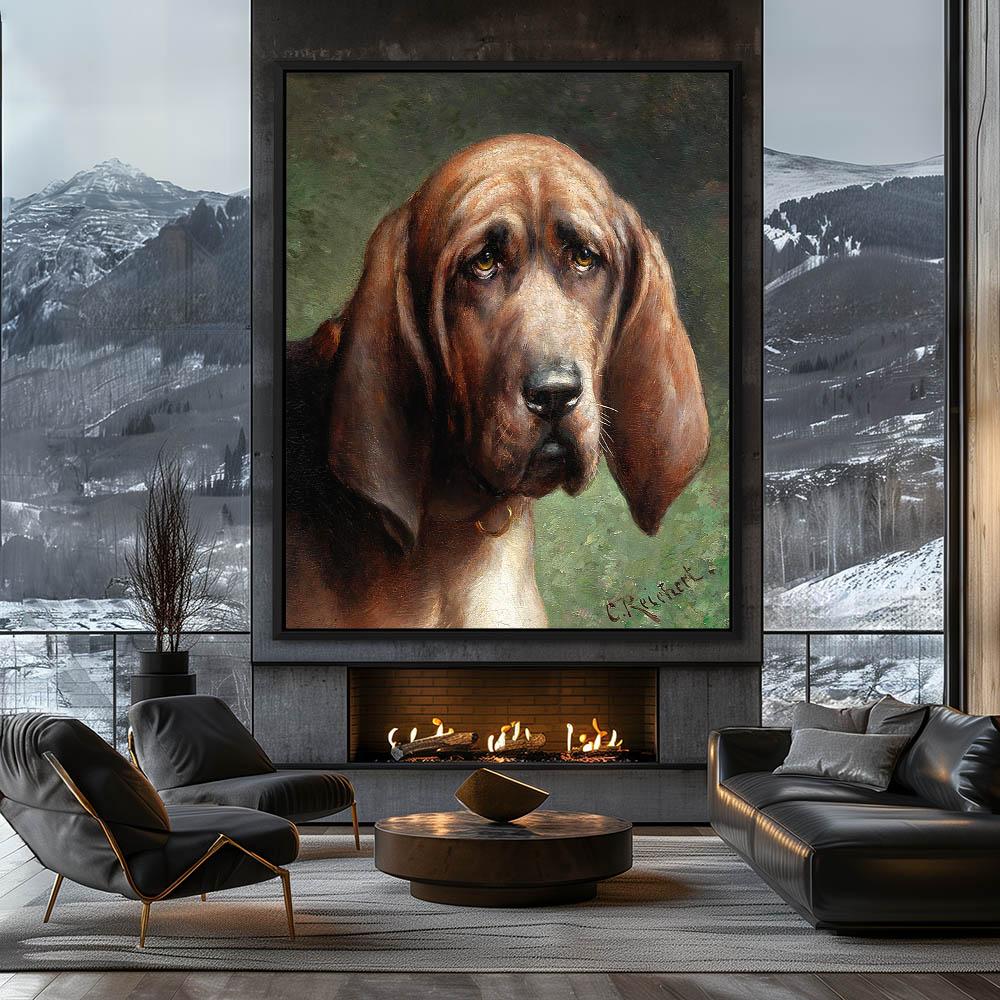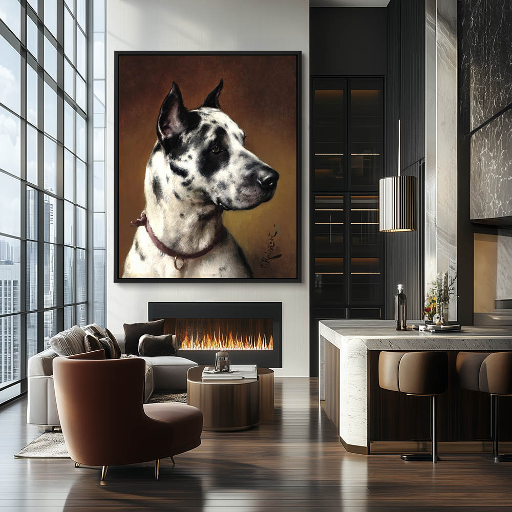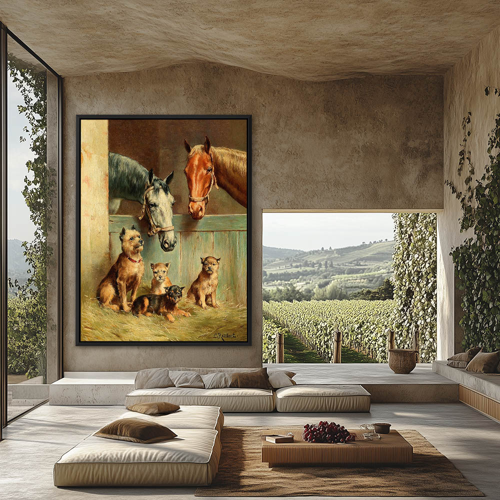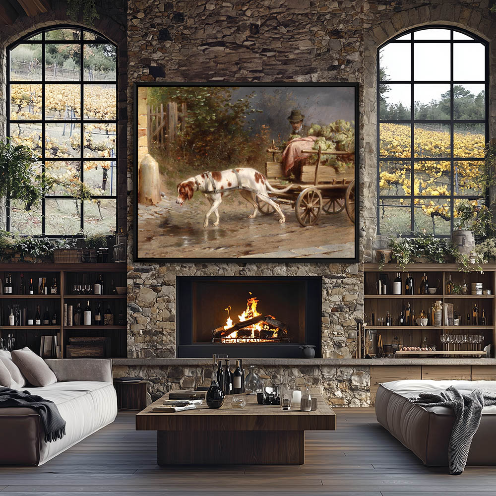 Little blonde girl in a blue dress offering a slice of apple to a fearful dog