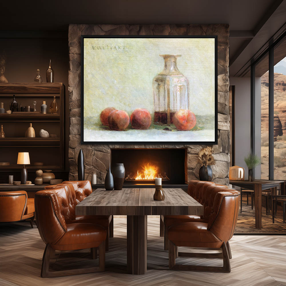 A carafe of wine and four peaches