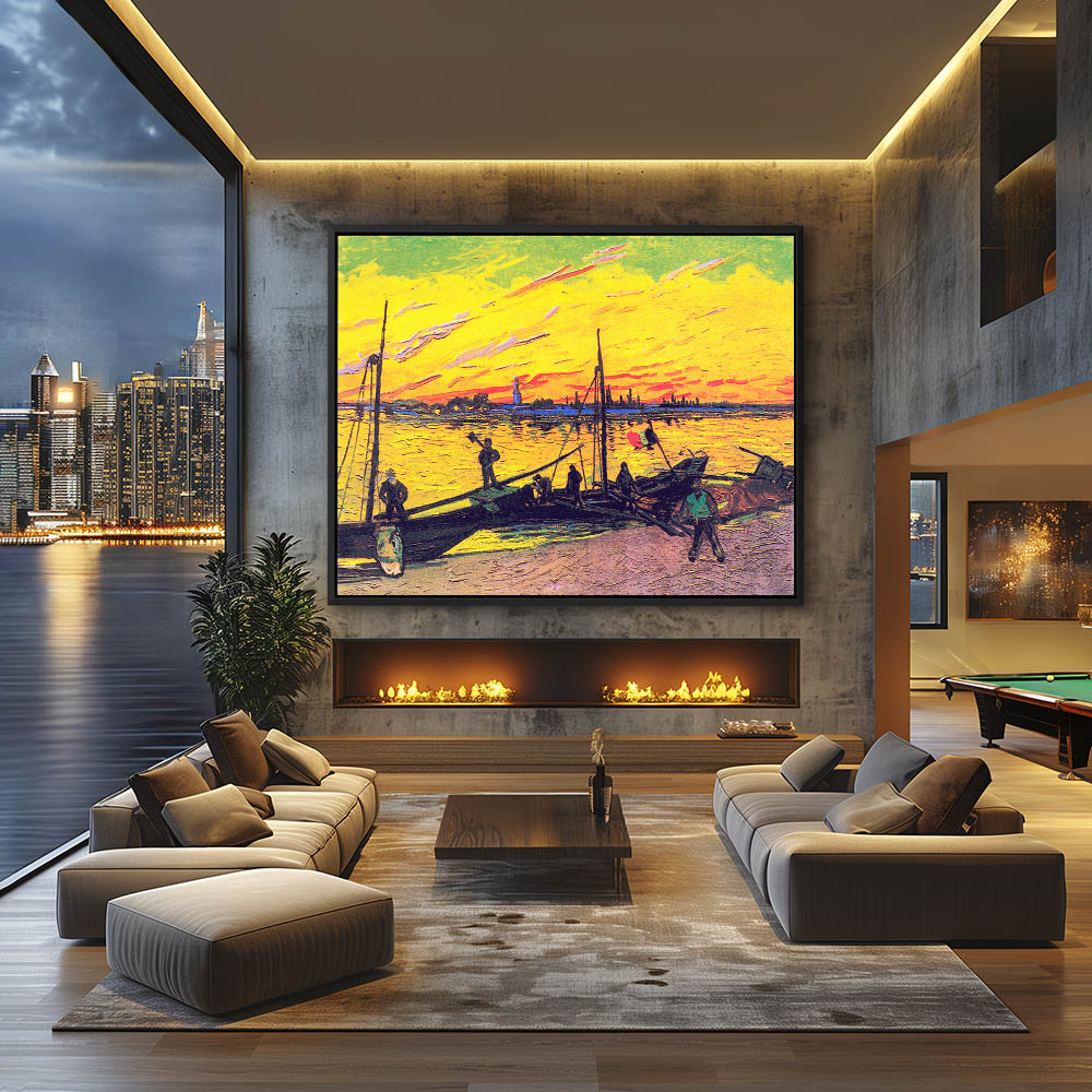 Impressionist Abstract Landscape Painting of Seascape with Figures in Boats at Shore