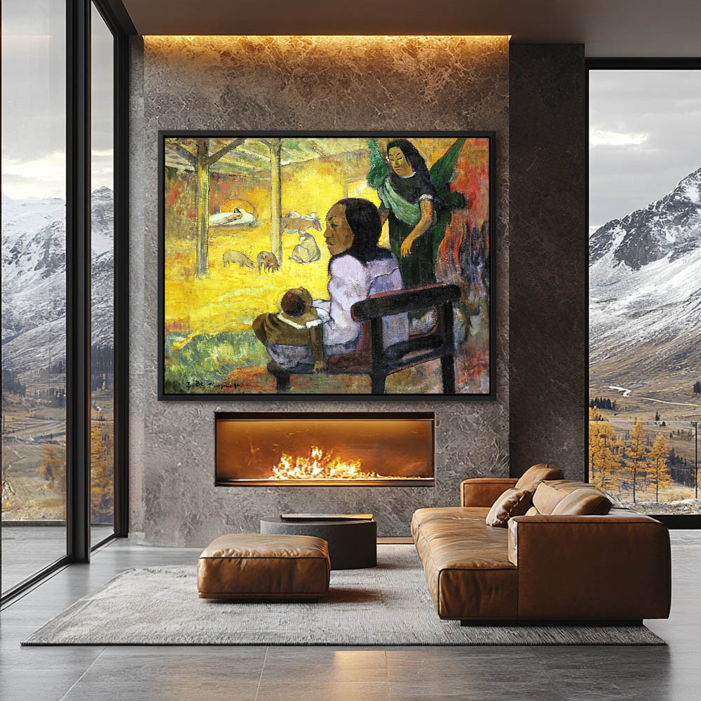 Woman and baby in a barn with cows and pigs as a depiction of the Nativity