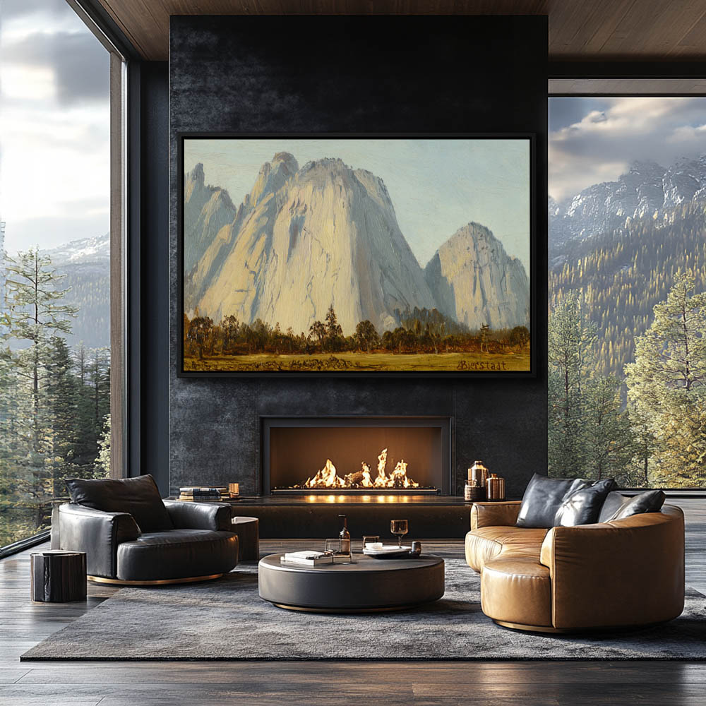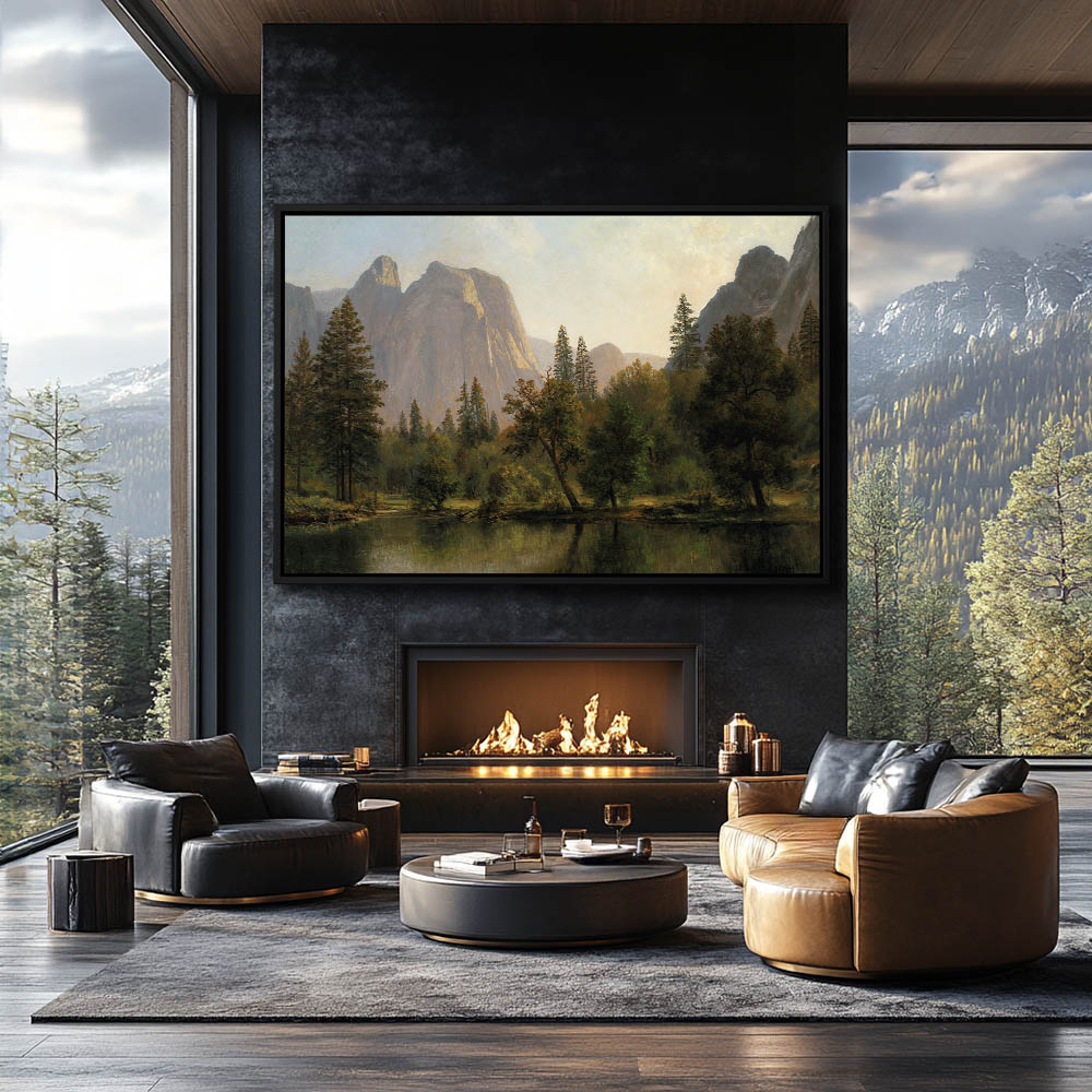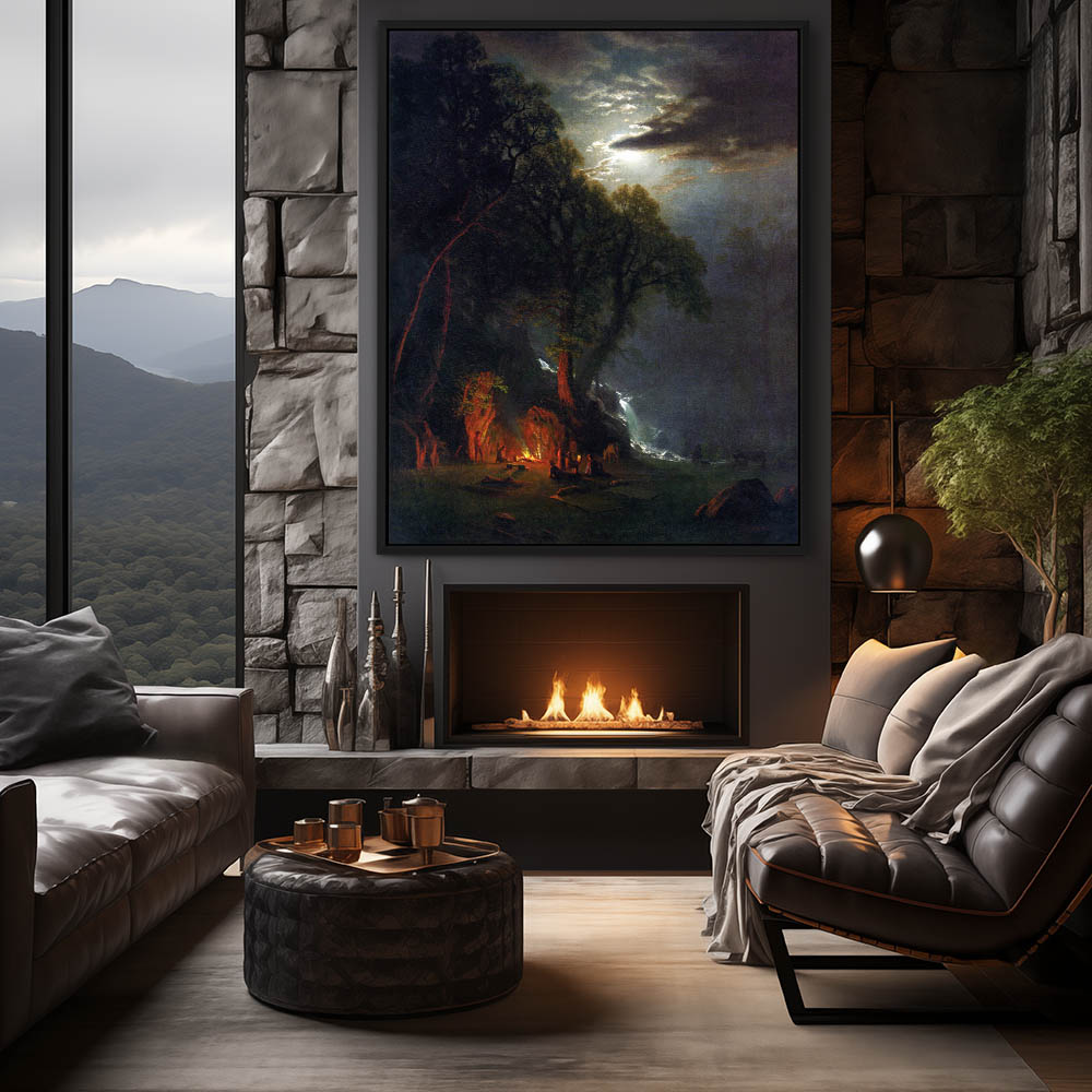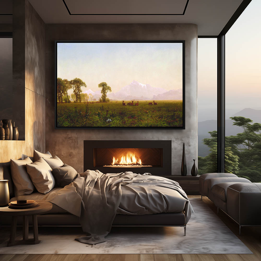 Vast landscape with mountains in the distance, a large lake and Indians on horseback traveling to the water through a valley in the foreground