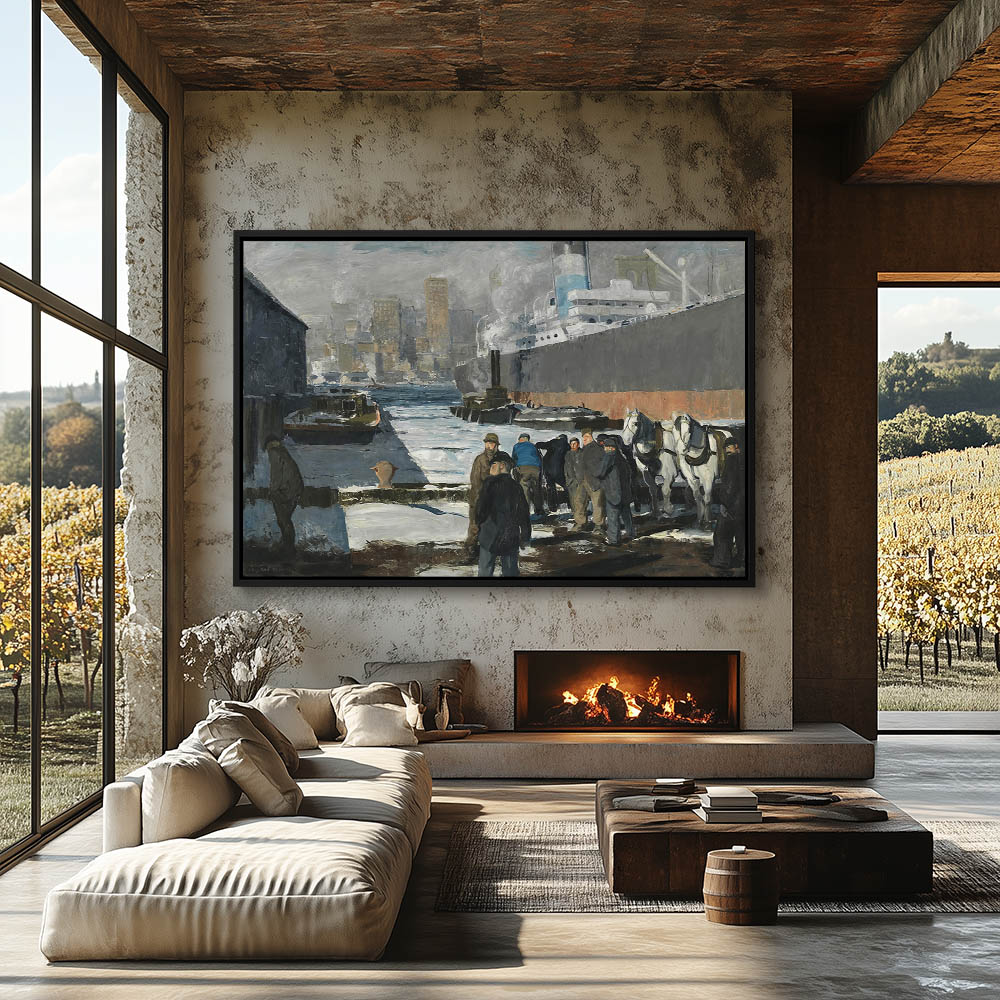 Men on the dock with boats and large ships and the NYC skyline in the background