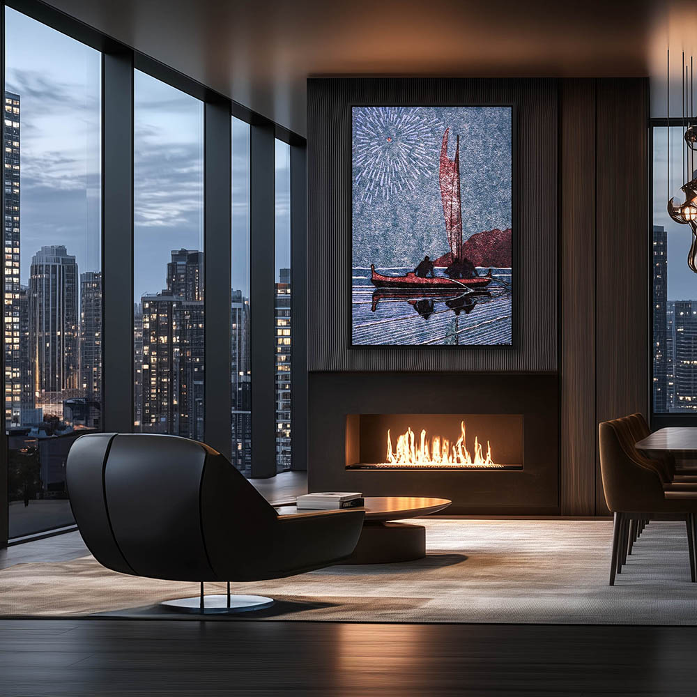 Abstract Painting with Figures in a Sailboat in a Hawaiian Marian Scene at Night with Fireworks
