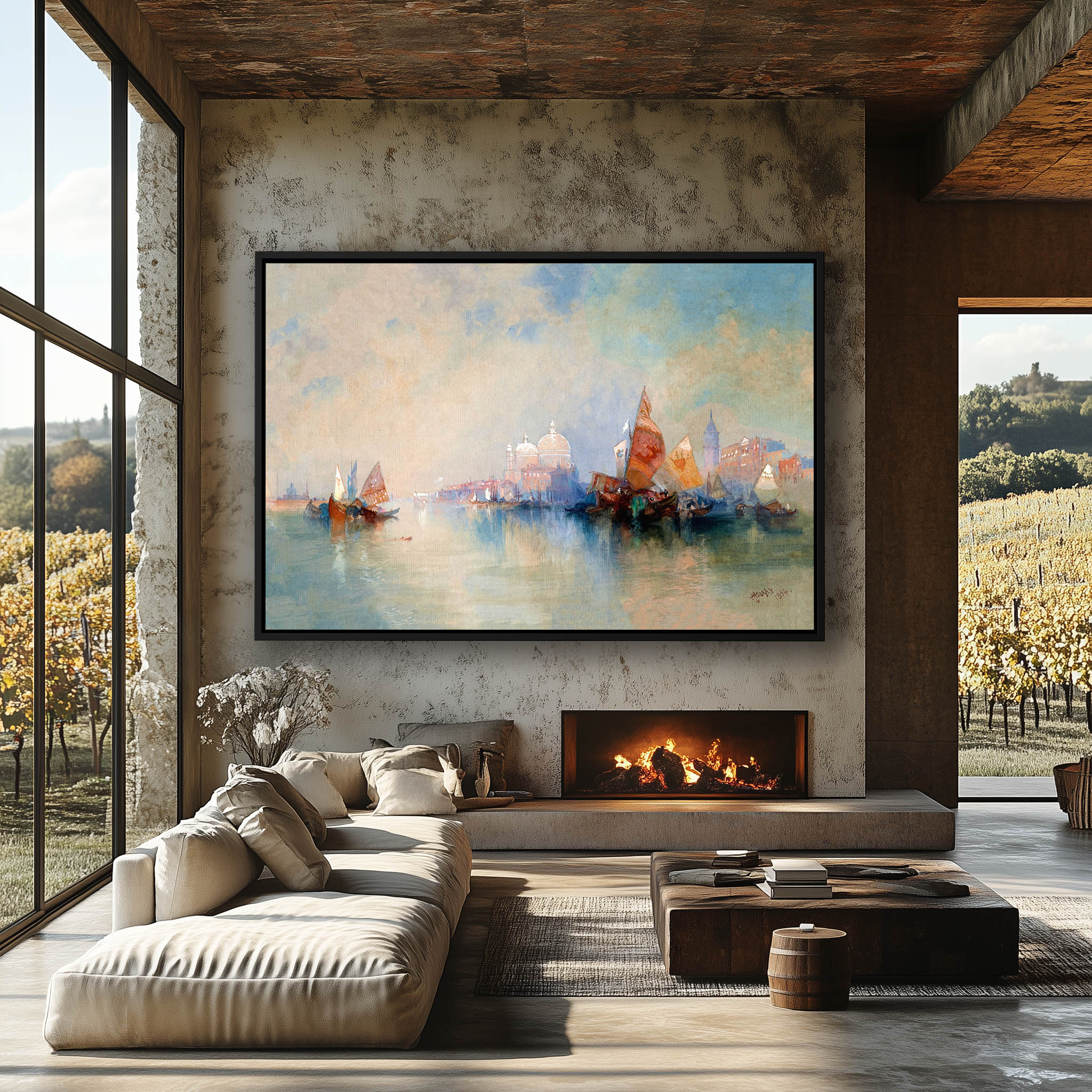 Vintage River Landscape with Sailboats on the Water