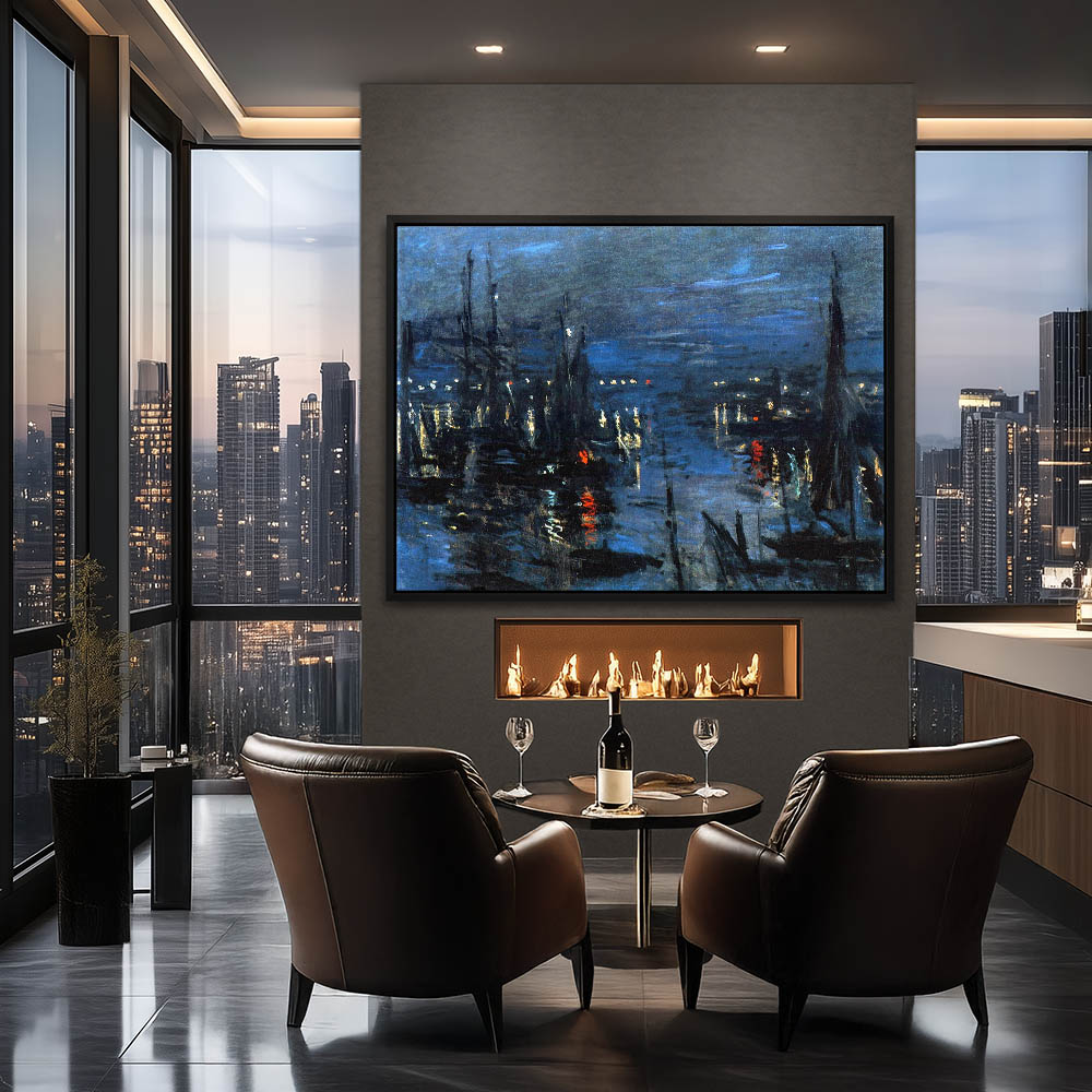 Vintage Seascape Painting of a Horbor at Night with Ships