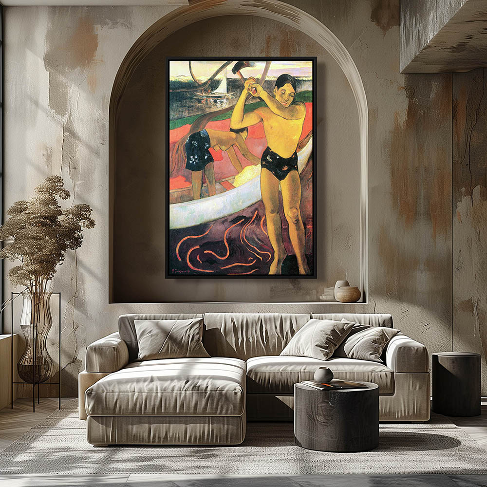 Vintage Figurative Painting of a Man Chopping wood and a Nude Woman