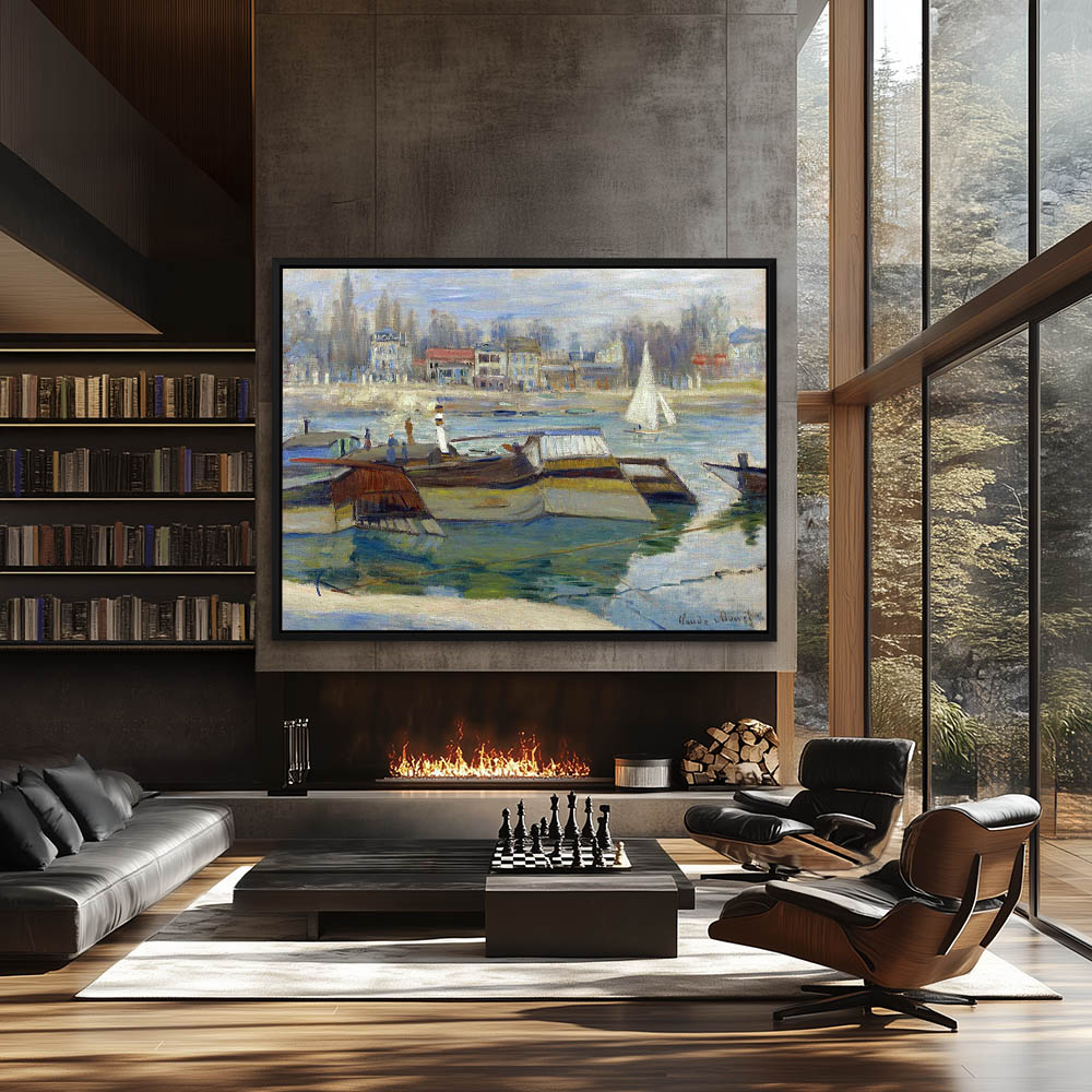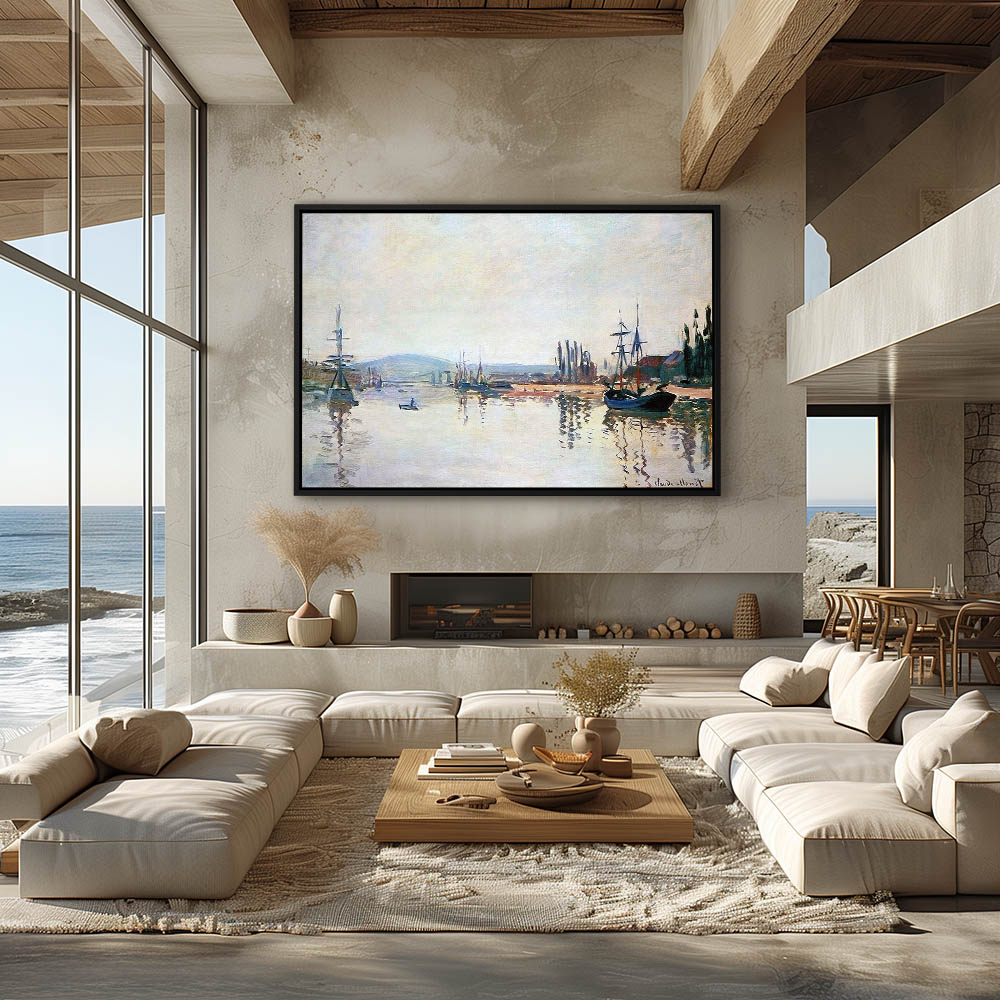 Vintage River Landscape Painting with Boats in the Water