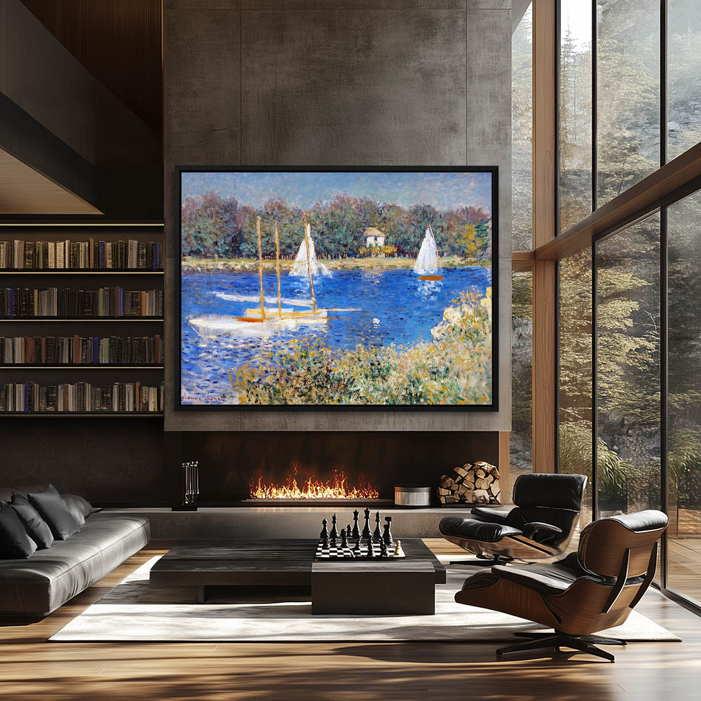 Vintage River Landscape Painting with Sailboats in the Water