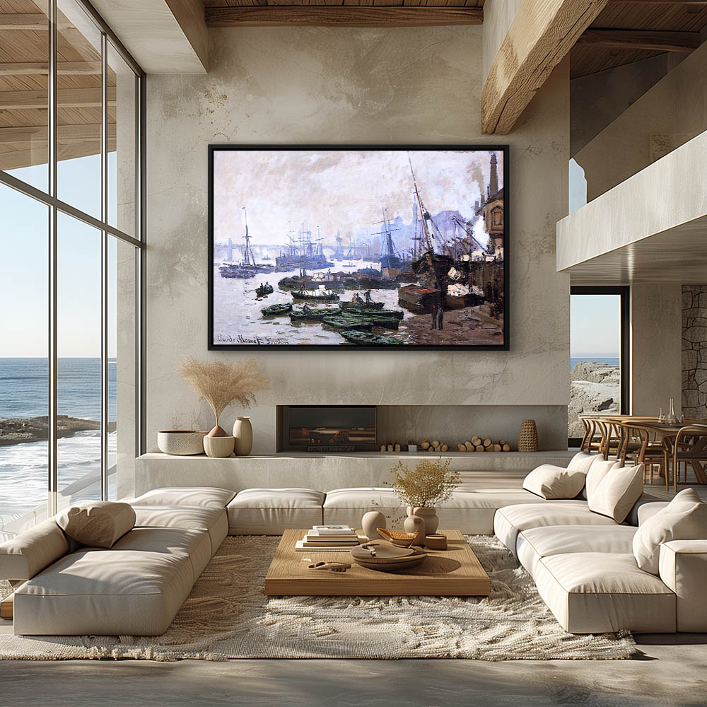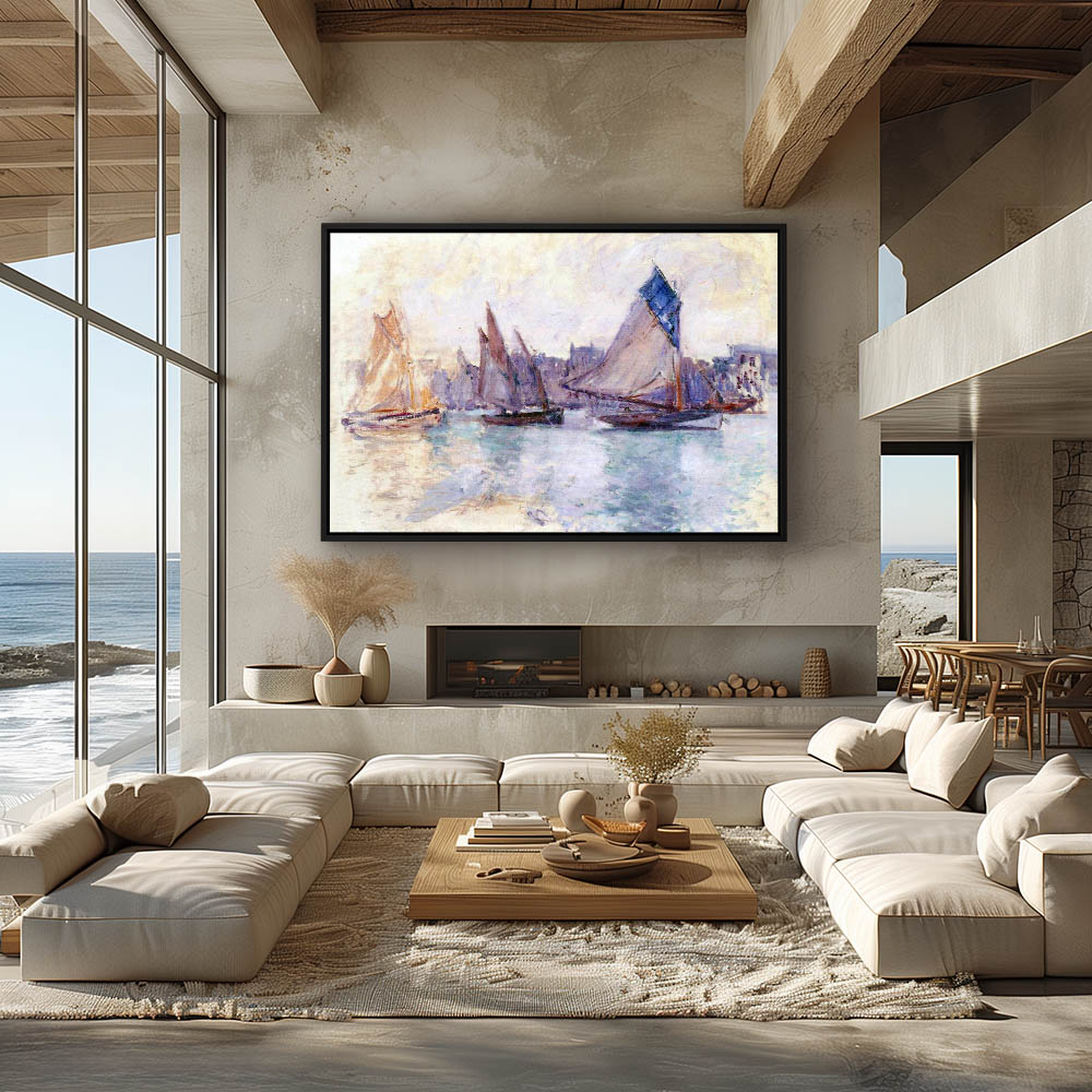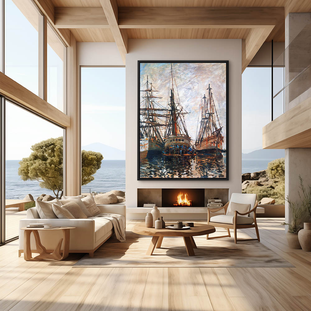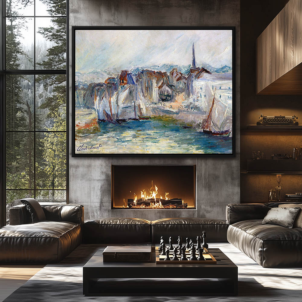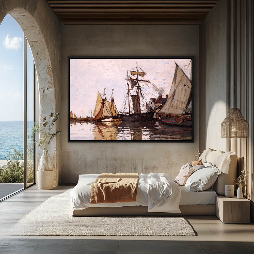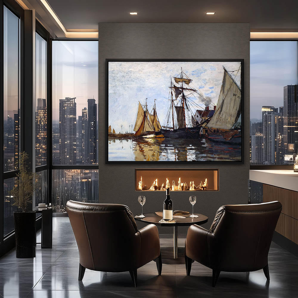Vintage Seascape Painting with Boats in the Port of Honfleur