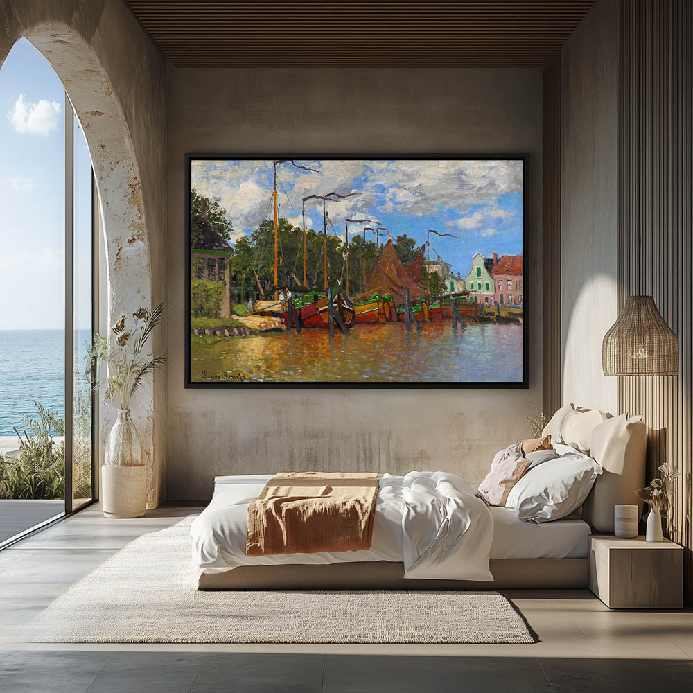 Vintage Landscape Painting with Boats Anchored at Shore