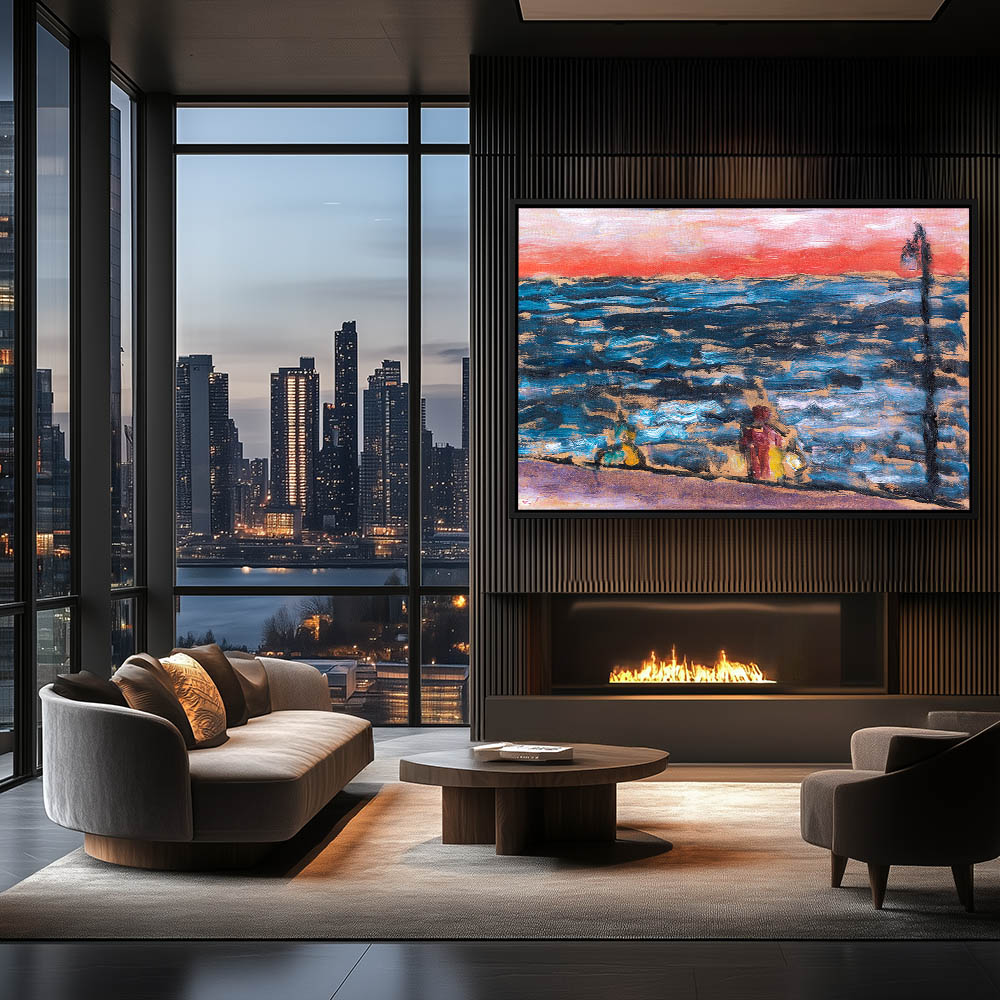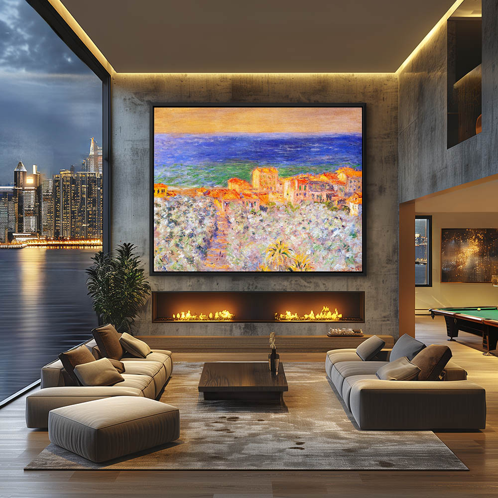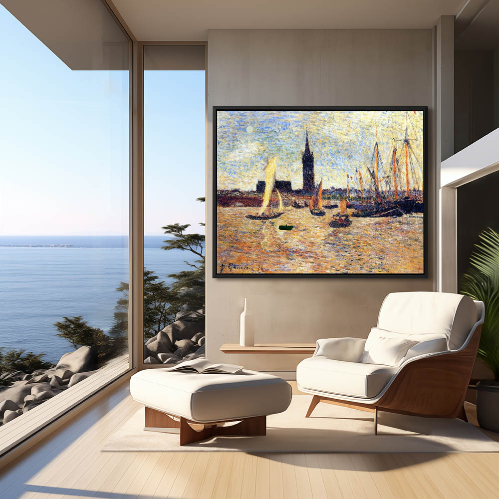 Vintage Landscape Painting with Views of the Sea and a Cityscape in ther Distance