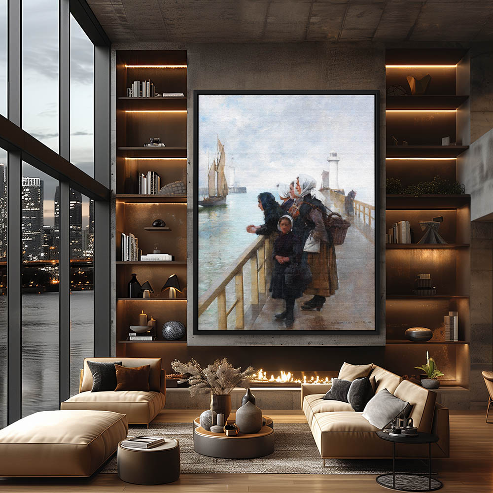 Coastal Painting with Women and Children on the Pier and Sail Boats