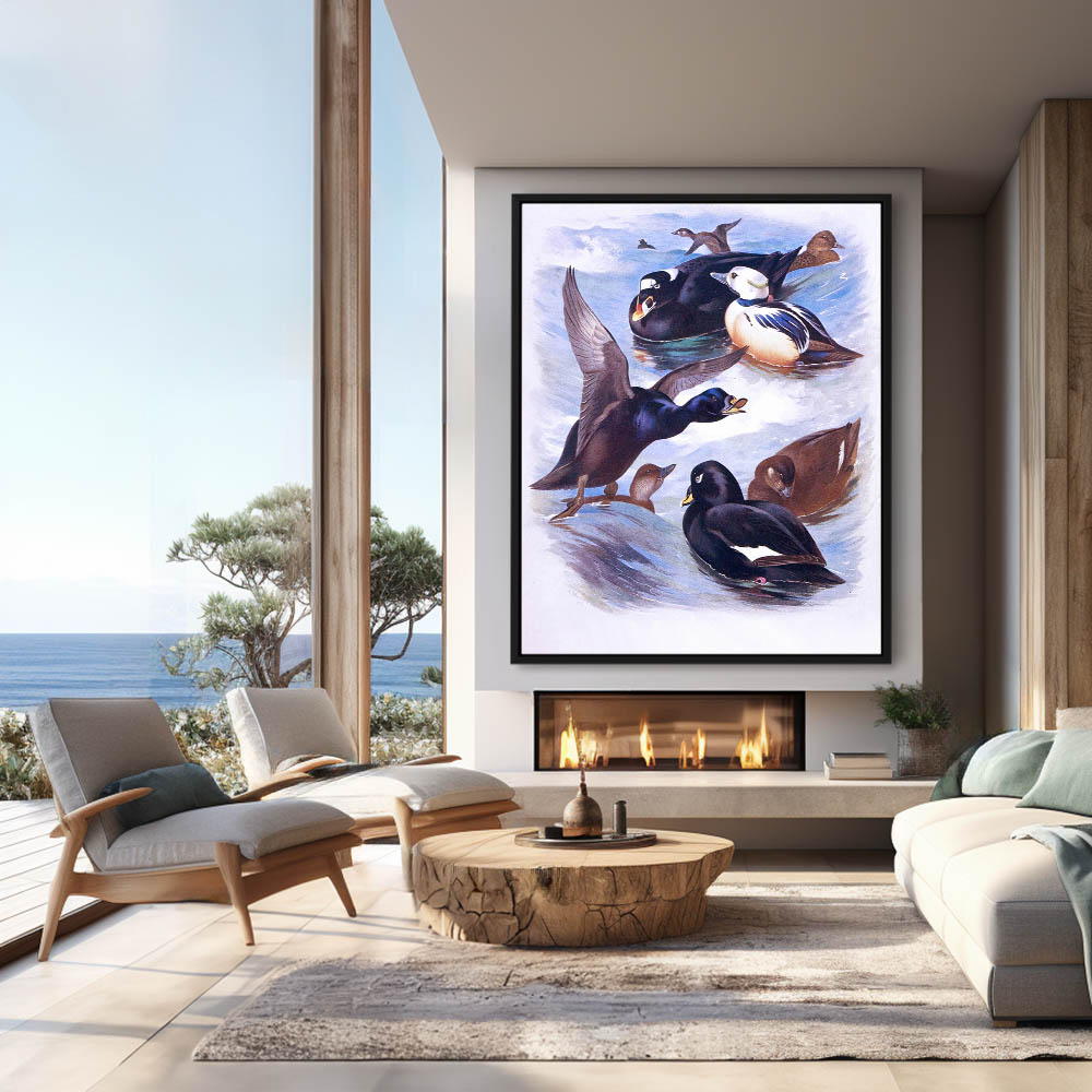 Painting of Various Ducks Stellers Eider Duck Velvet Scoter Surf Scoter and Common Scoter