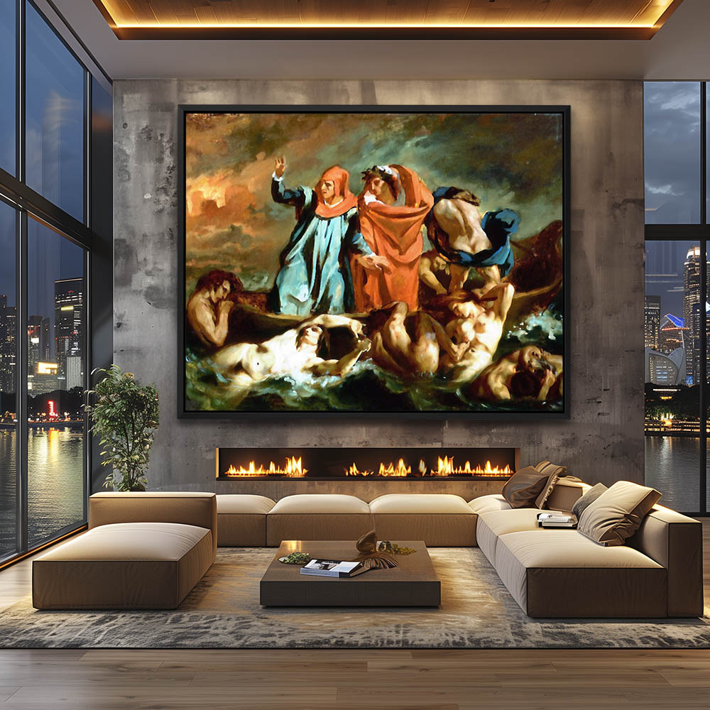 Vintage Figurative Painting with Figures in a Boat and the Water