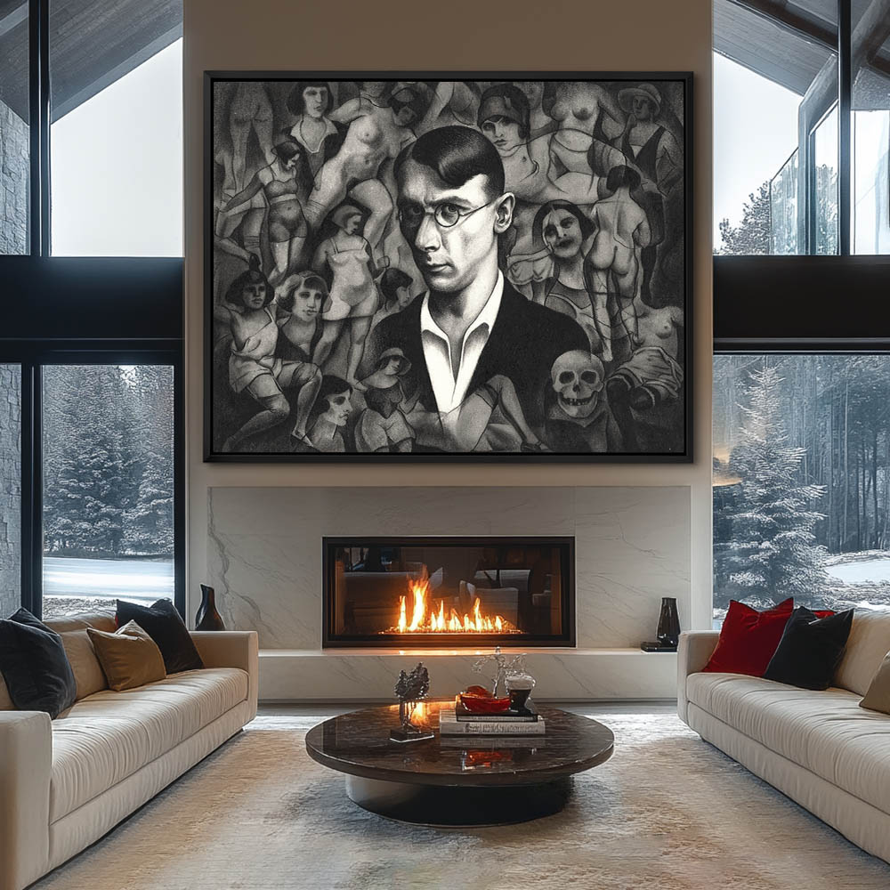 Self portrait surrounded by women in various stages of undress and a skull to the bottom