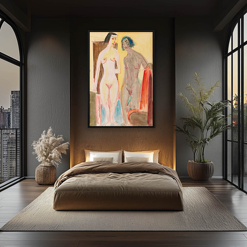 Vintage Figurative Painting of Two Nude Women on the Beach in the Depiction of Life and Death