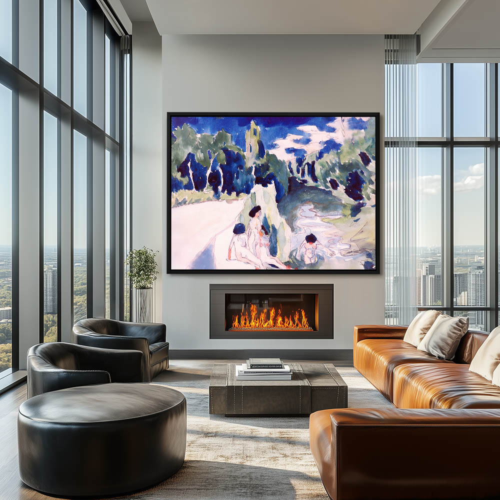 From $29.970 out of 5Abstract Landscape Painting in Watercolor with Bathers in the River