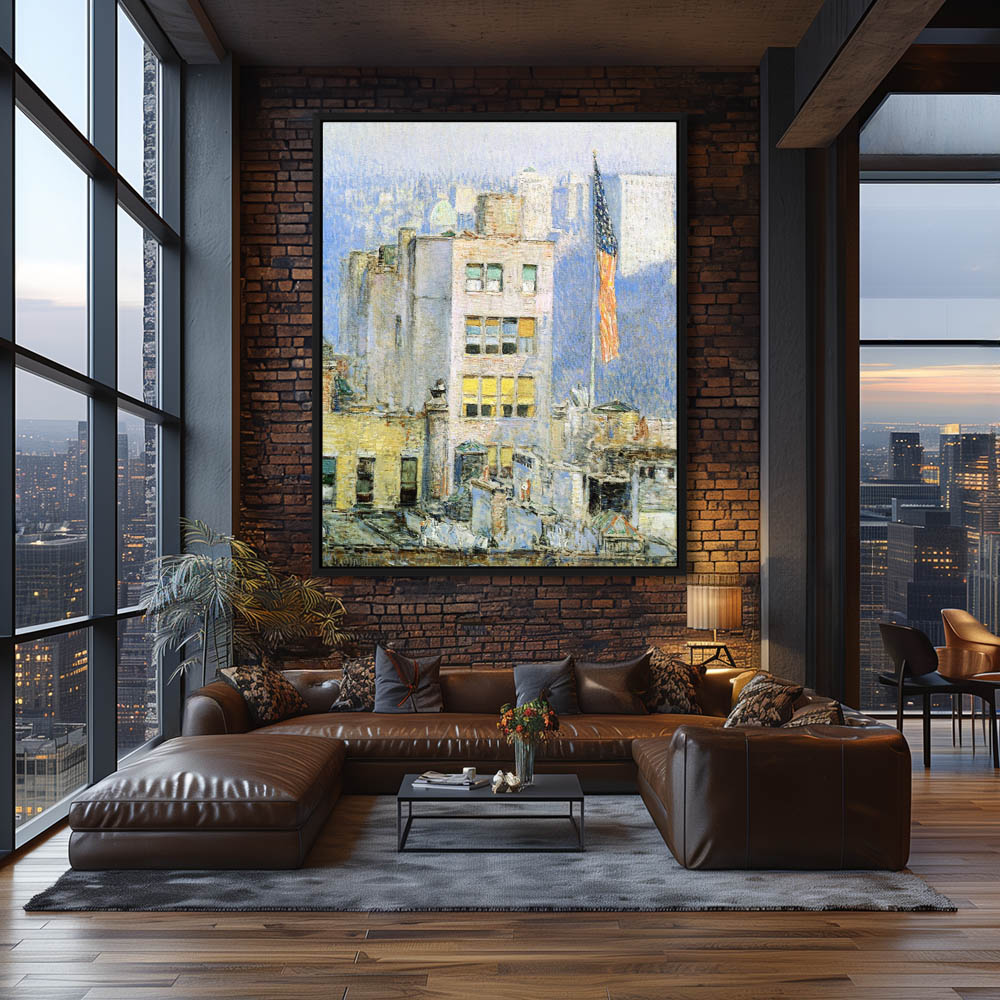 Vintage Cityscape Painting with Flags
