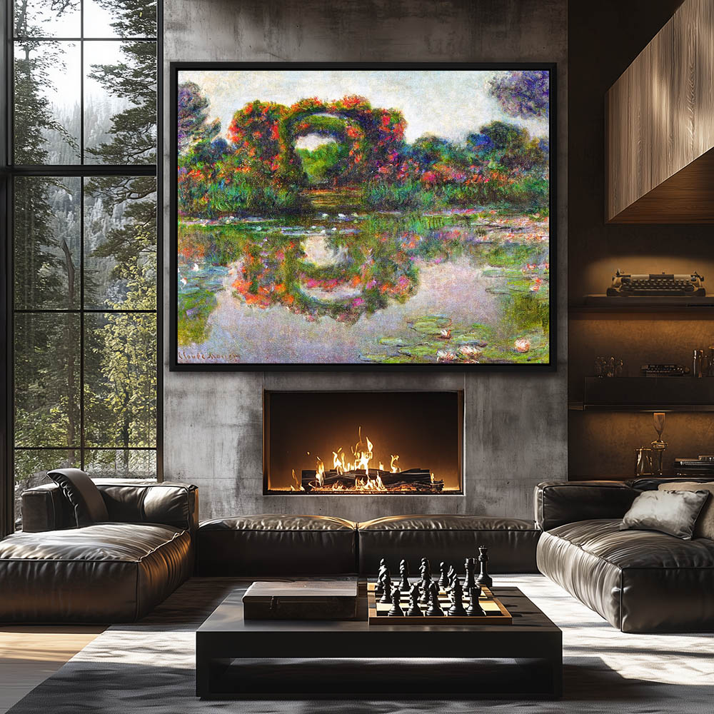Vintage Pond Painting of Watter Lillies with Flowers and Rose Arches in Giverny