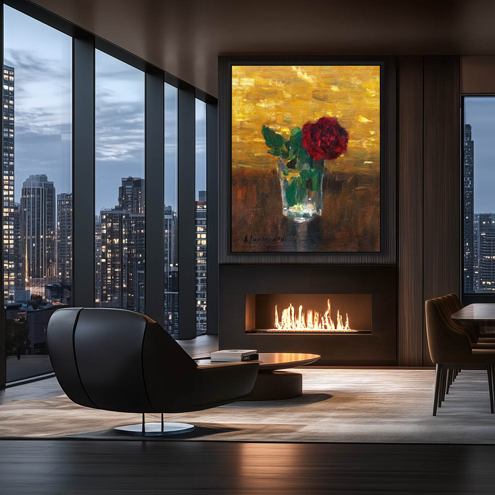 A Still Life Painting with a Single Red Rose in a Glass