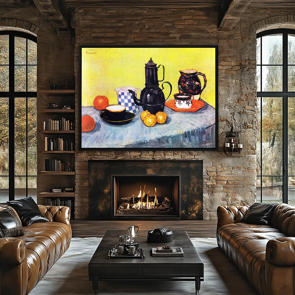 Impressionist Still Life Painting with Coffee Pot and Fruit and Dishes