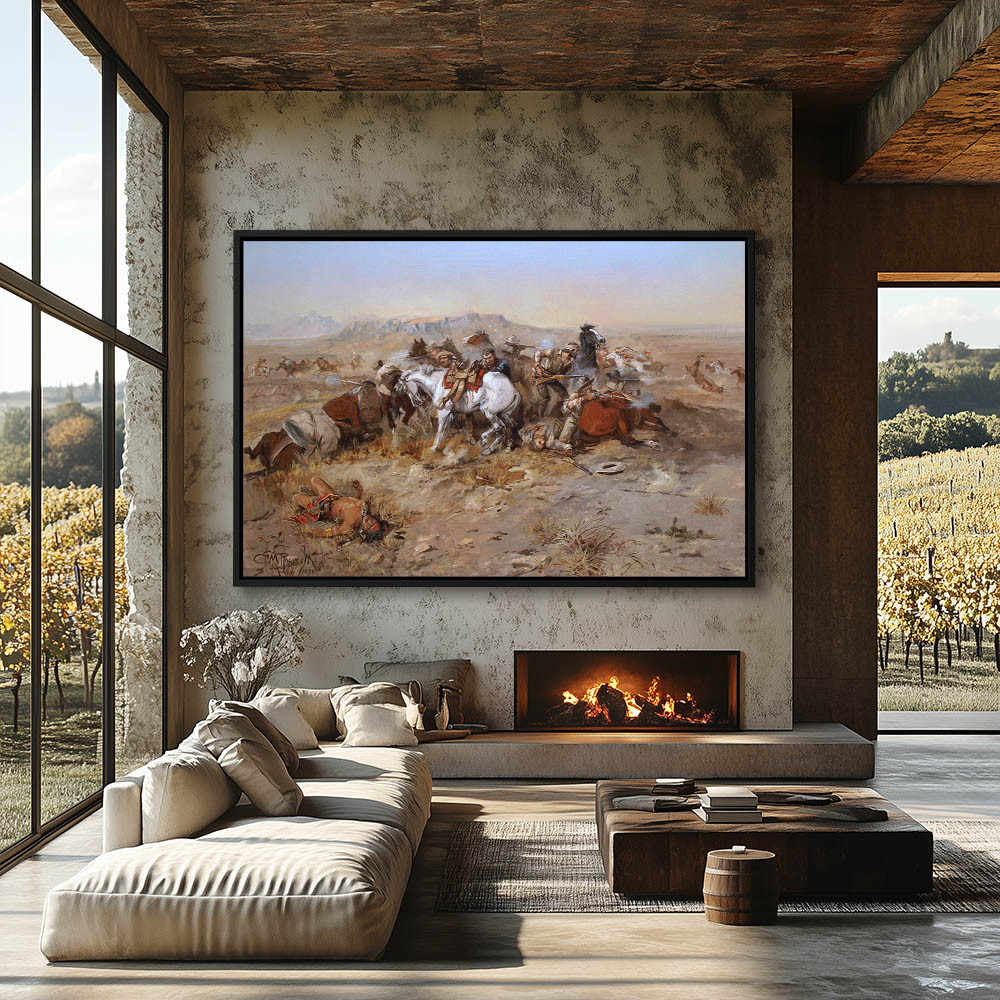 Indians circling Cowboys huddled back to back behind horses laid down for cover