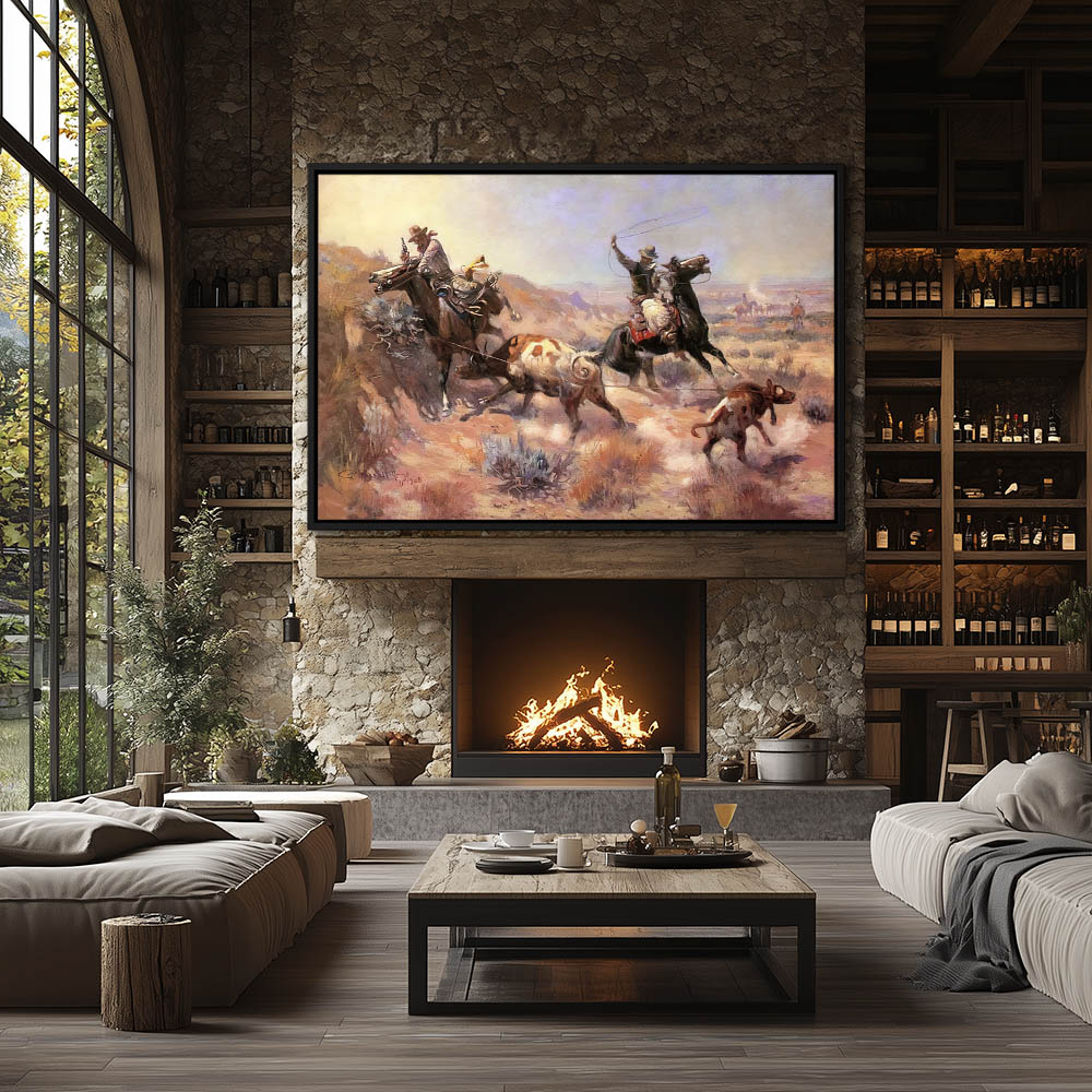 Cowboys cornered by a steer while roping a calf for branding