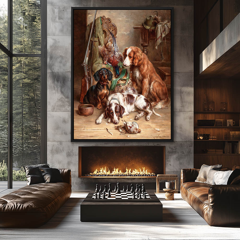 Three dogs sitting a laying next to hunting gear and birds