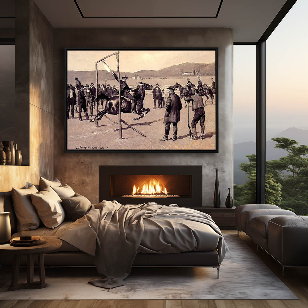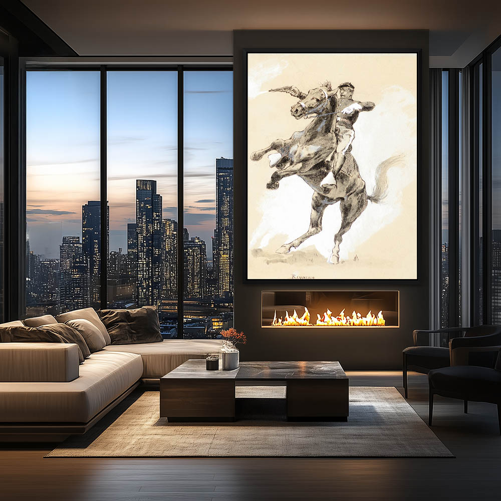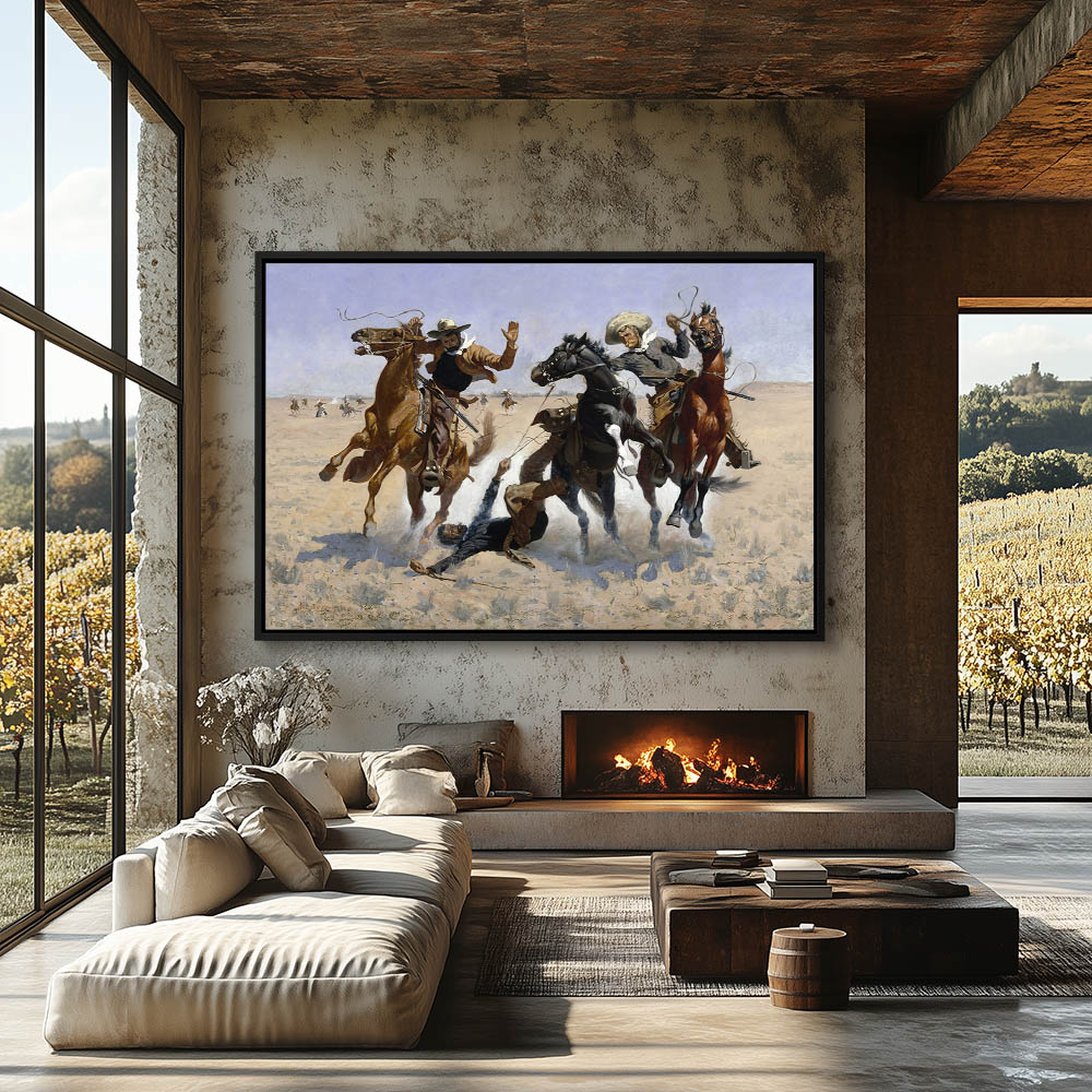 Two cowboys on horseback stopping the horse of a third man who has fallen off, while a skirmish with the Indians is taking place