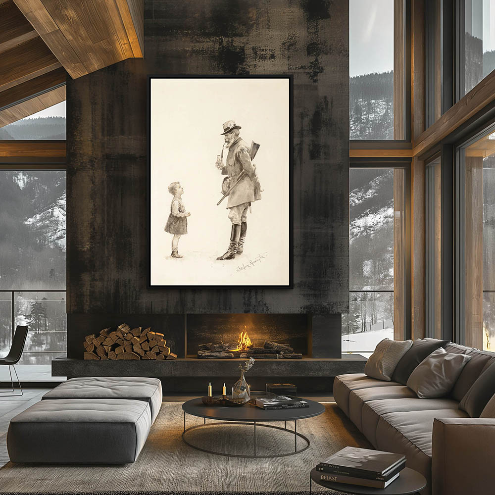 Small girl talking to a bearded man with a rifle, pipe and a flower in his hat