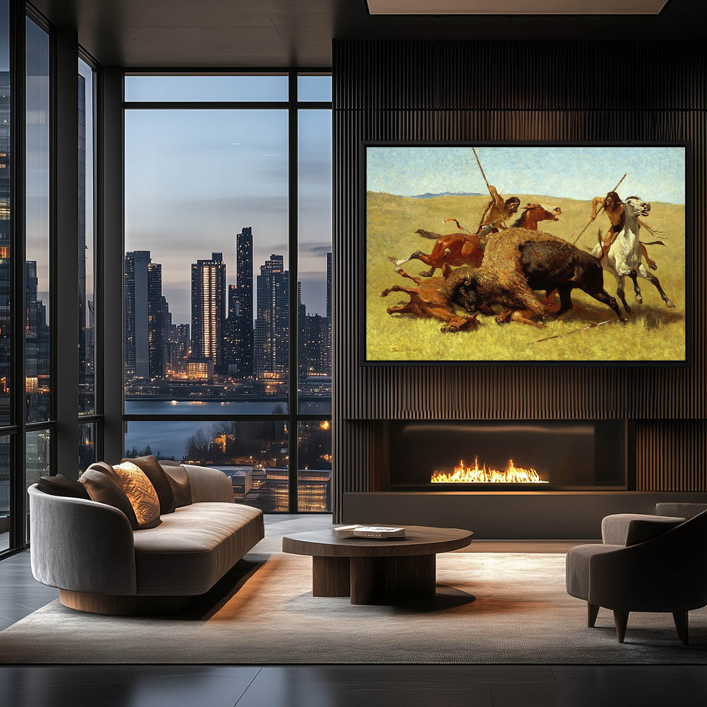 Two Indians on horseback killing a buffalo with spears, while a third horse and Indian lay on the ground under the buffalo