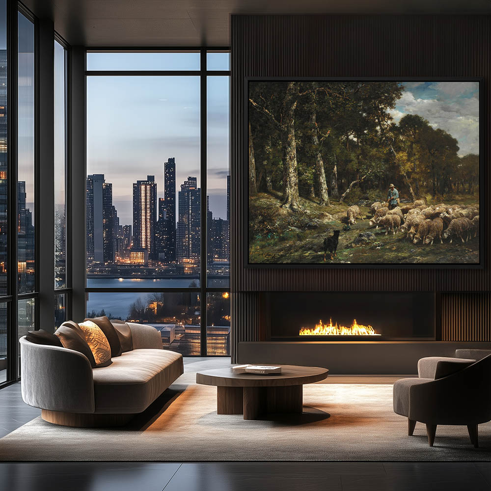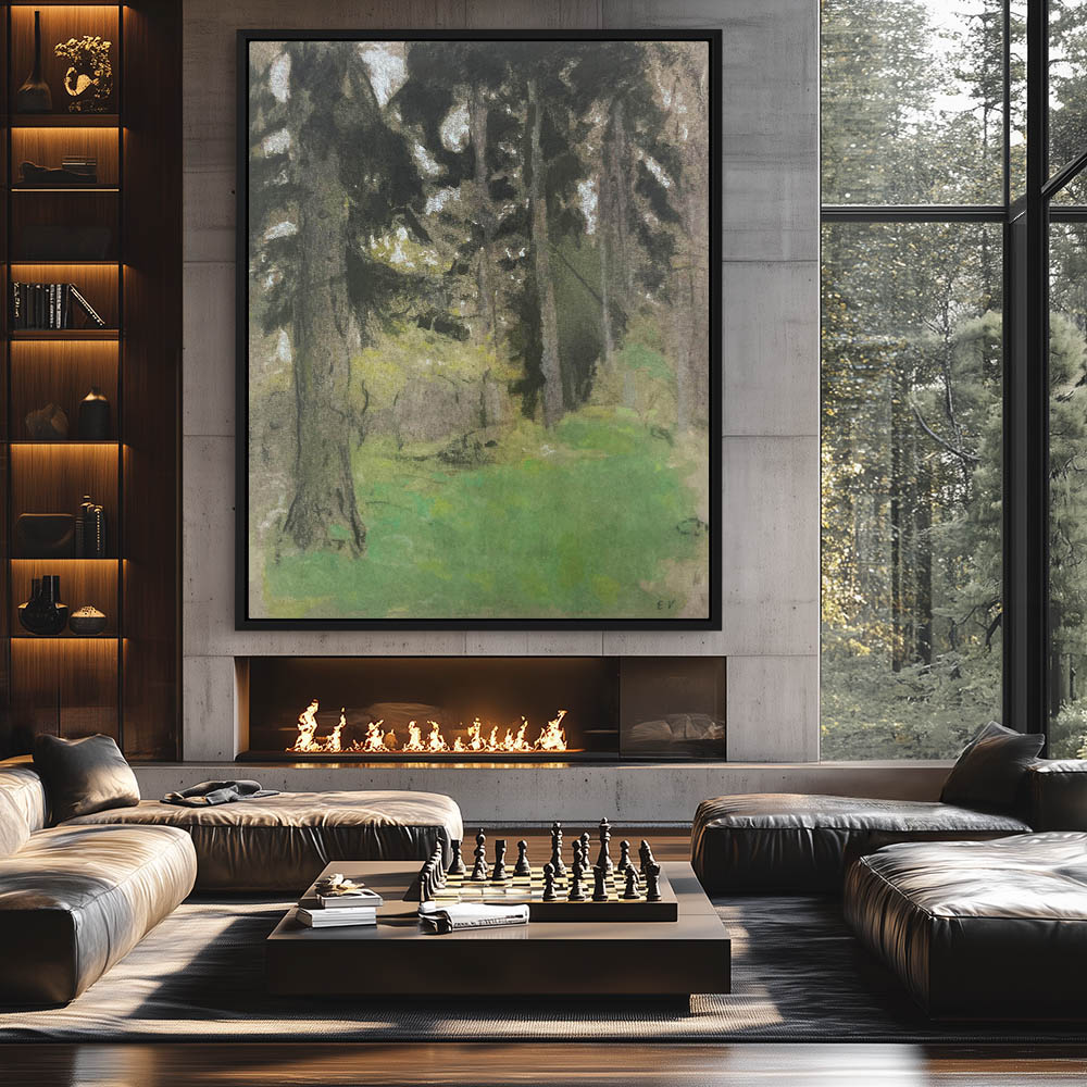 Vintage Landscape Painting of a Forest by the Lake with Picnic Tables