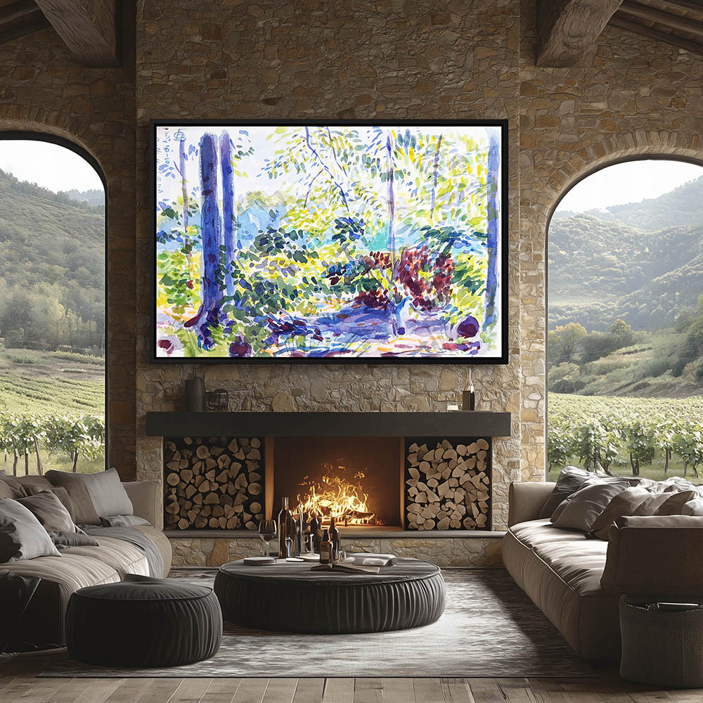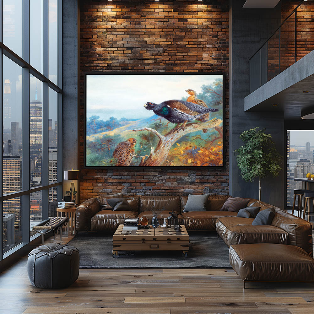 Forest Landscape Painting with a Cock and Hen Pheasant in Autumn