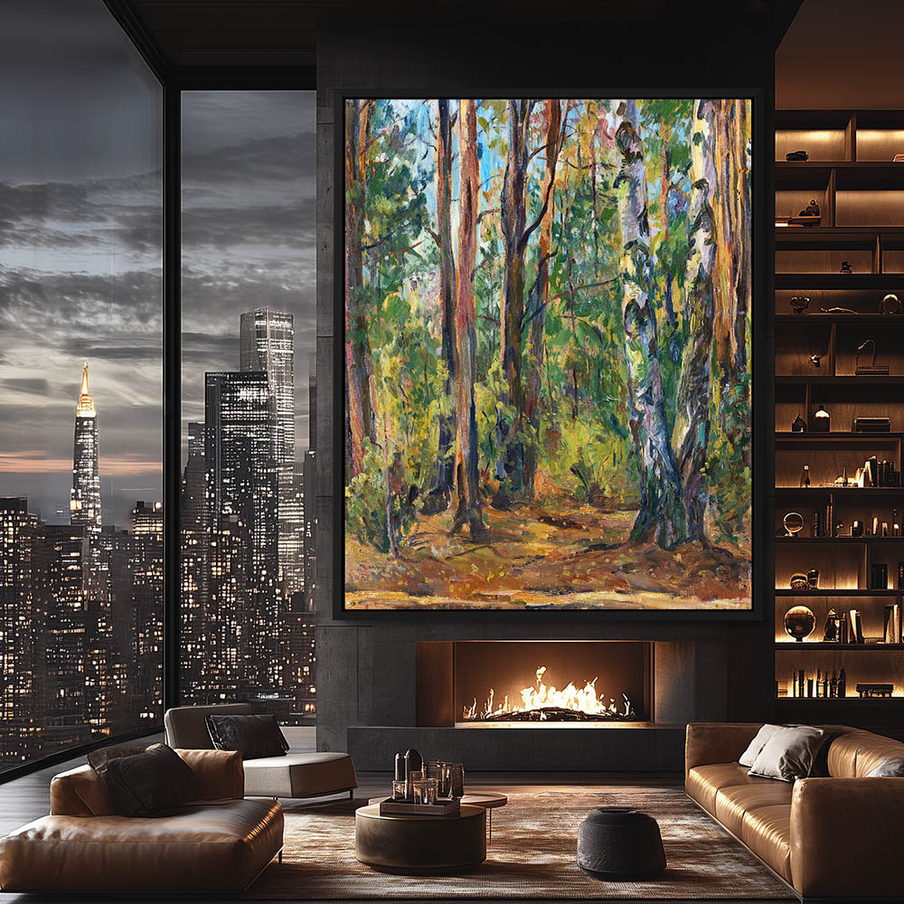 Deer at the edge of a lake just beyond the treeline at the foot of a towering mountain range.