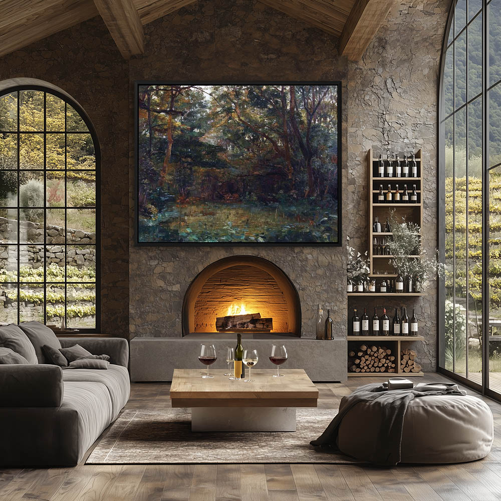 Forest Landscape Painting with Trees and Pond