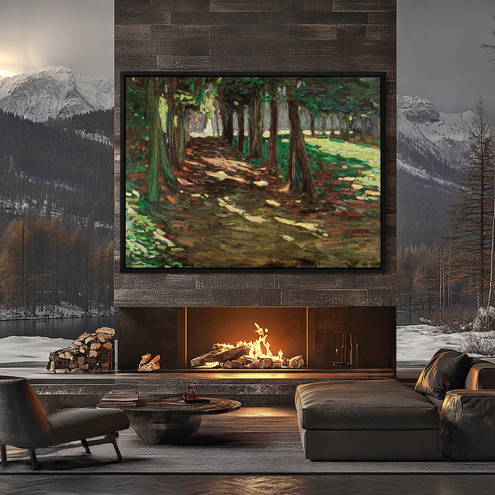 Forest Landscape Painting with Cottage Figures and Birds