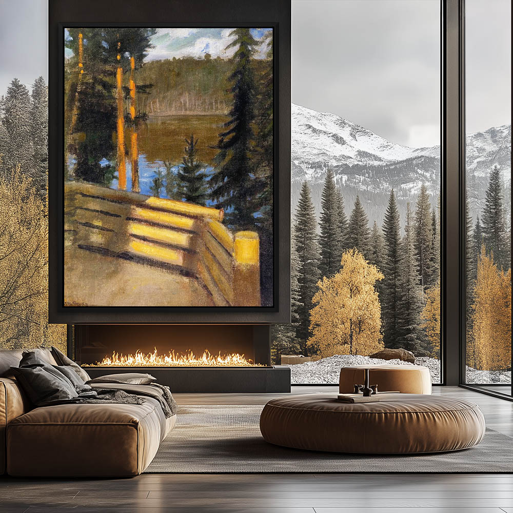 Landscape Paintingof a Lake View from the Cabin Porch with Trees