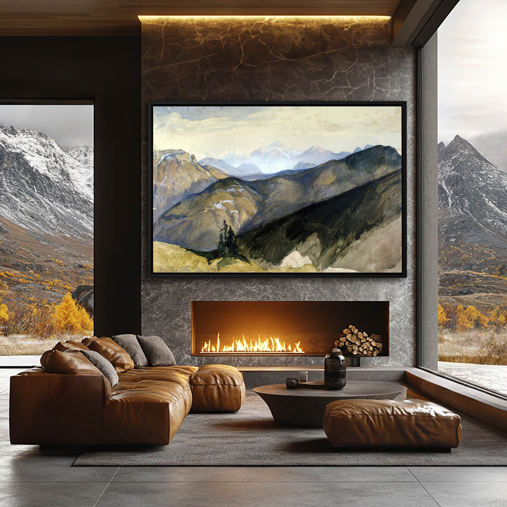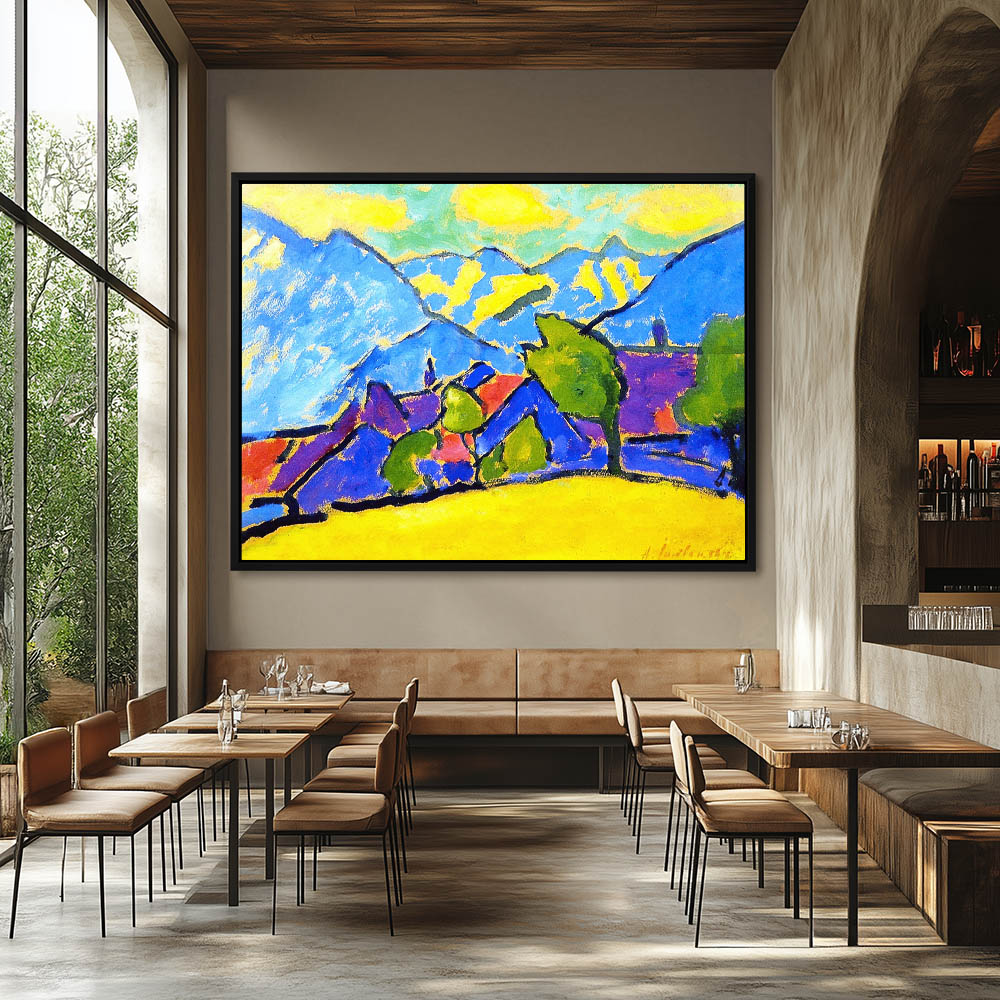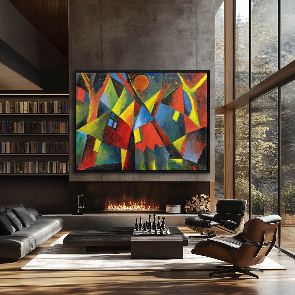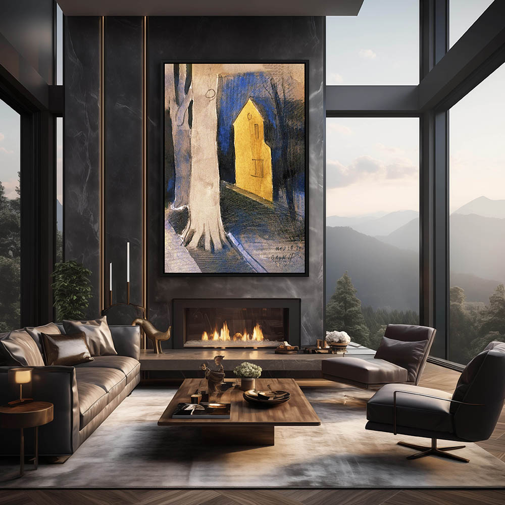 Abstract LandscapePainting with Blue Mountains and Houses and Trees
