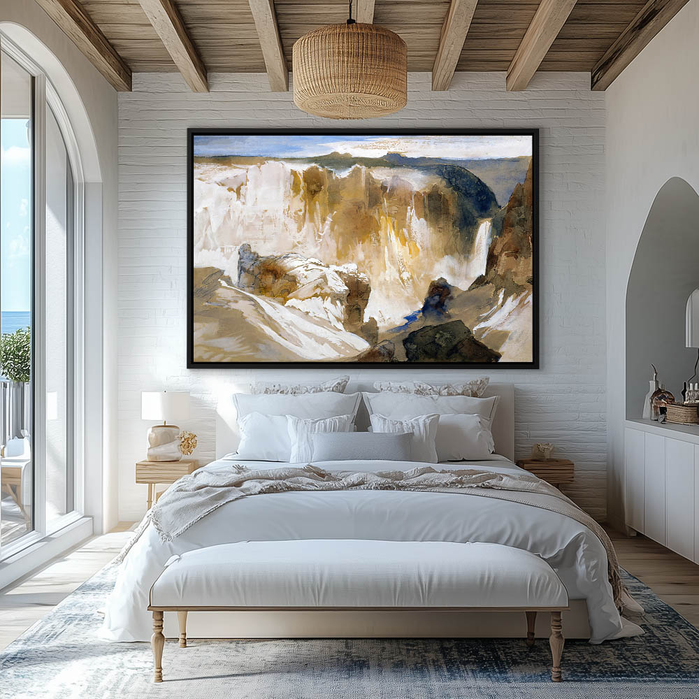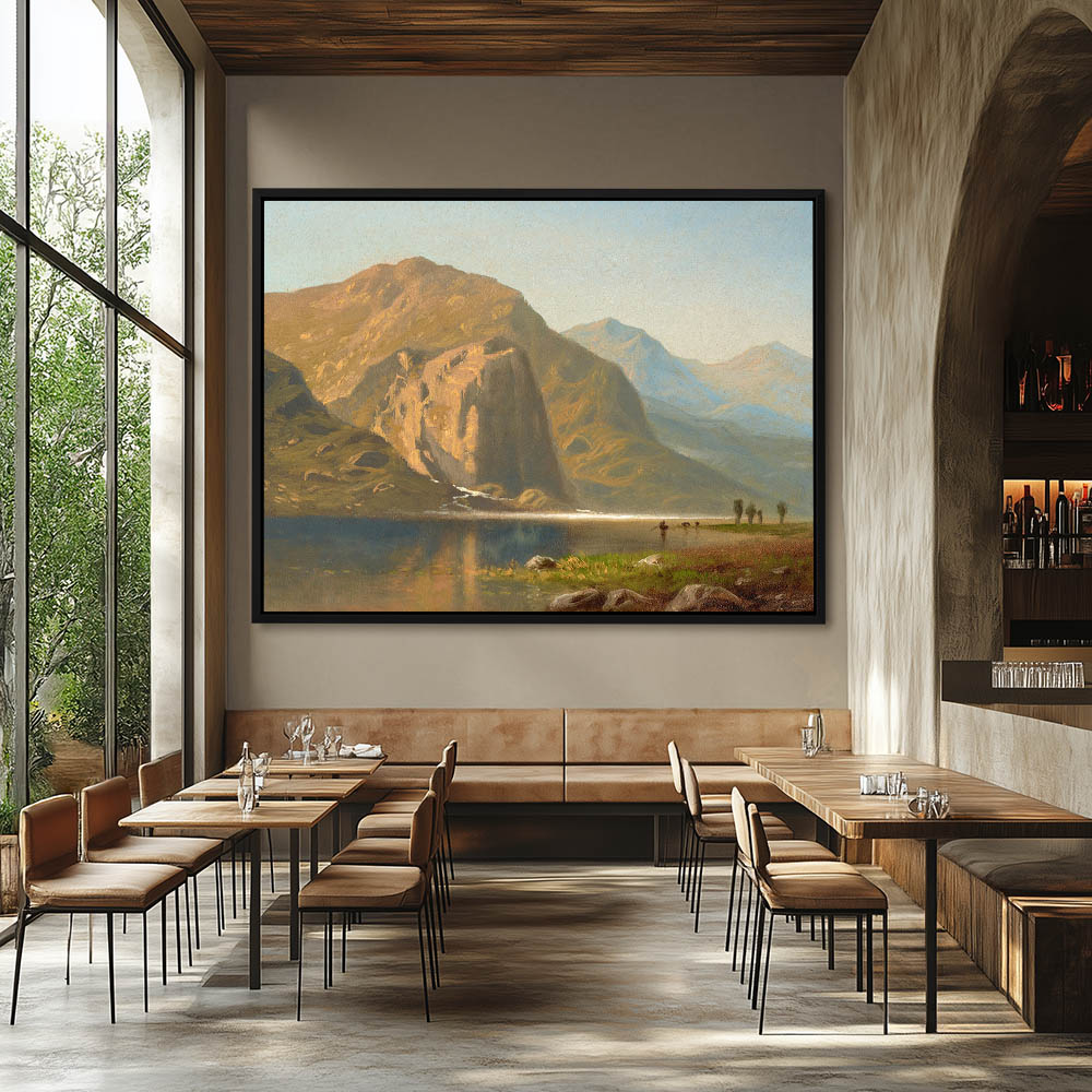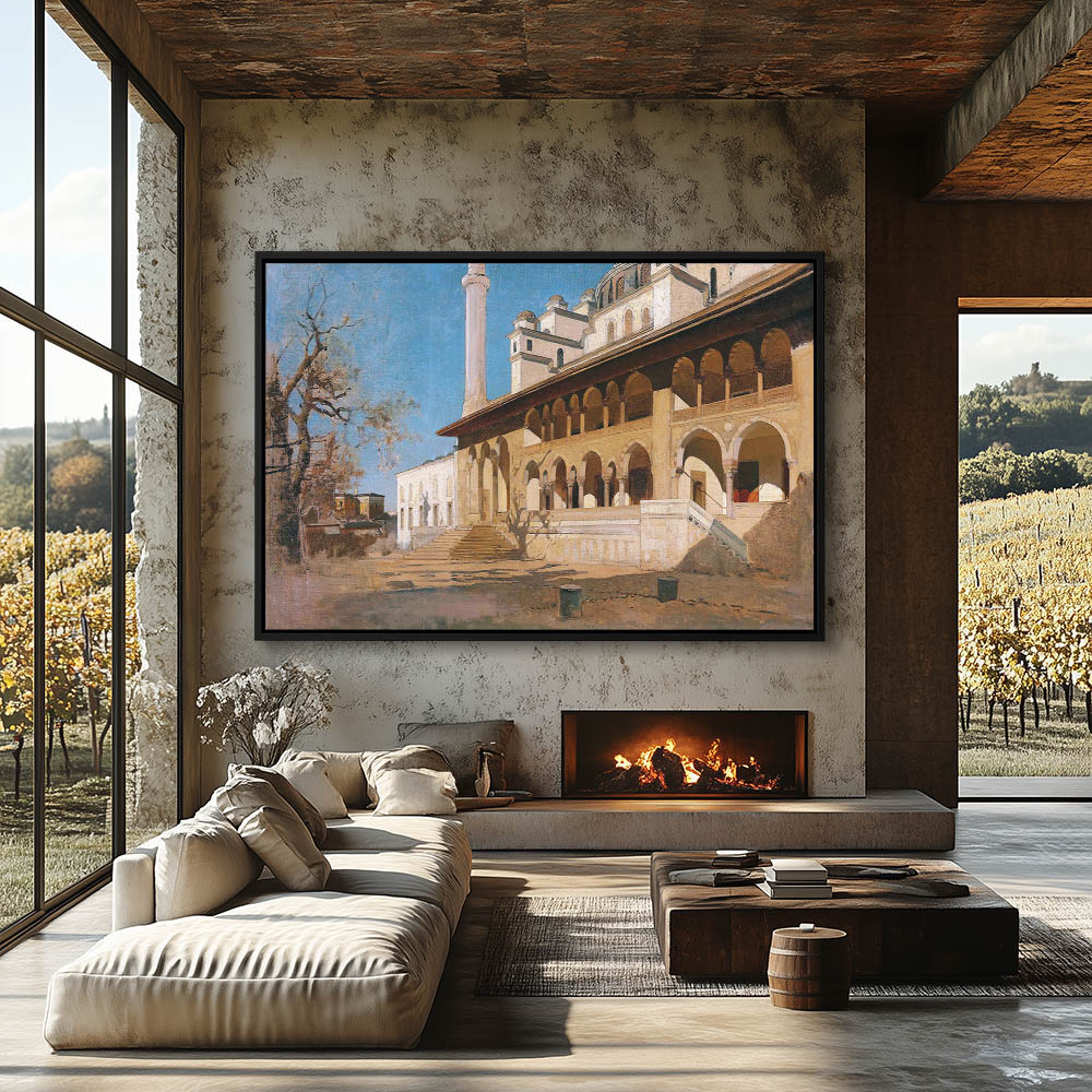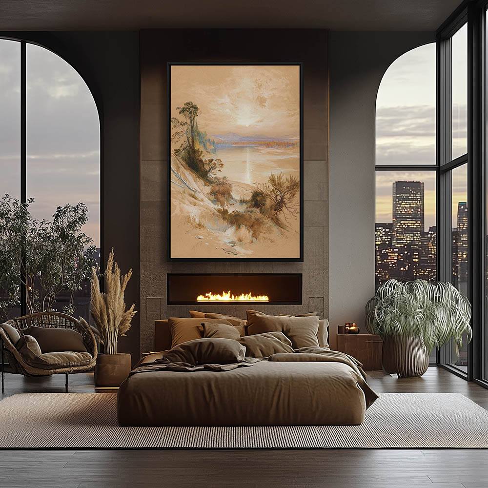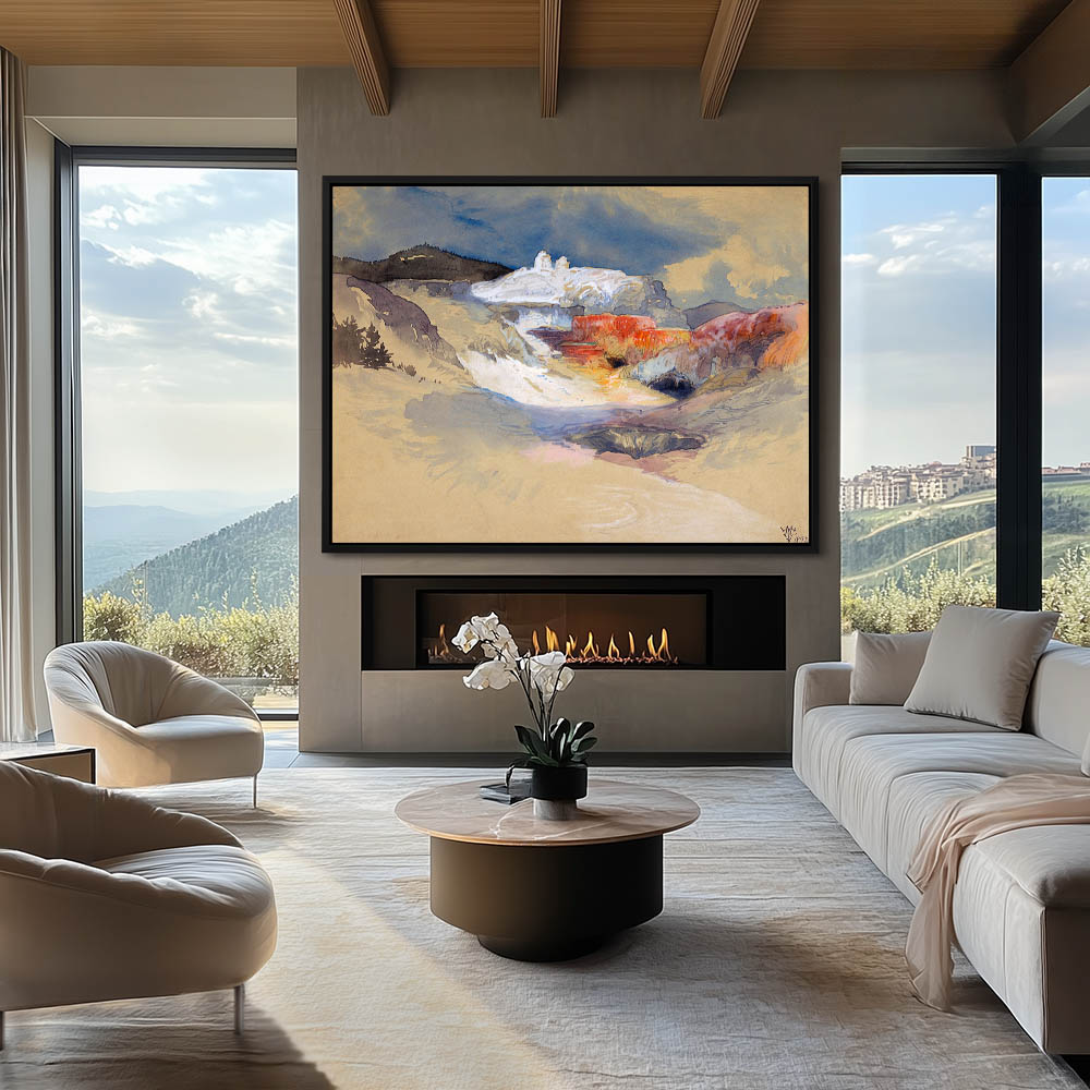 Abstract LandscapePainting with Blue Mountains and Houses and Trees
