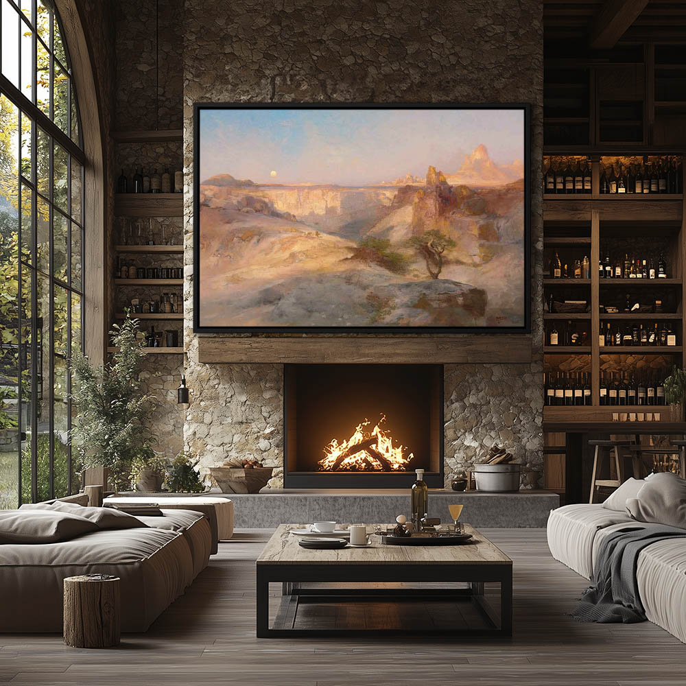 From $31.970 out of 5Glow of a campfire sheilded behind a large rock from the light of a full moon across a lake in the background