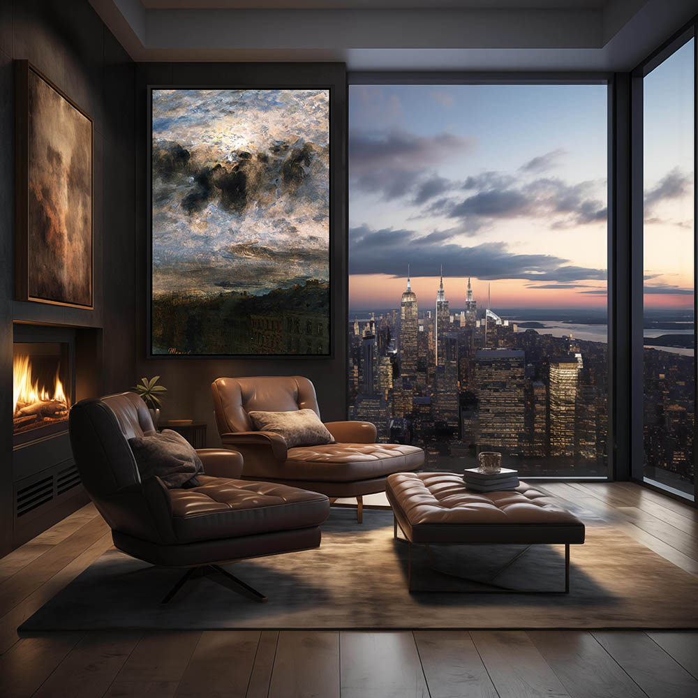 Dark and moody cityscape painting of a street view at night, perfect for home décor, wall décor, or as a striking piece of wall art. Available as a painting, stretched canvas, metal wall art, metal prints, framed prints, fine art prints, poster art, or canvas wall art framed with floater frames.