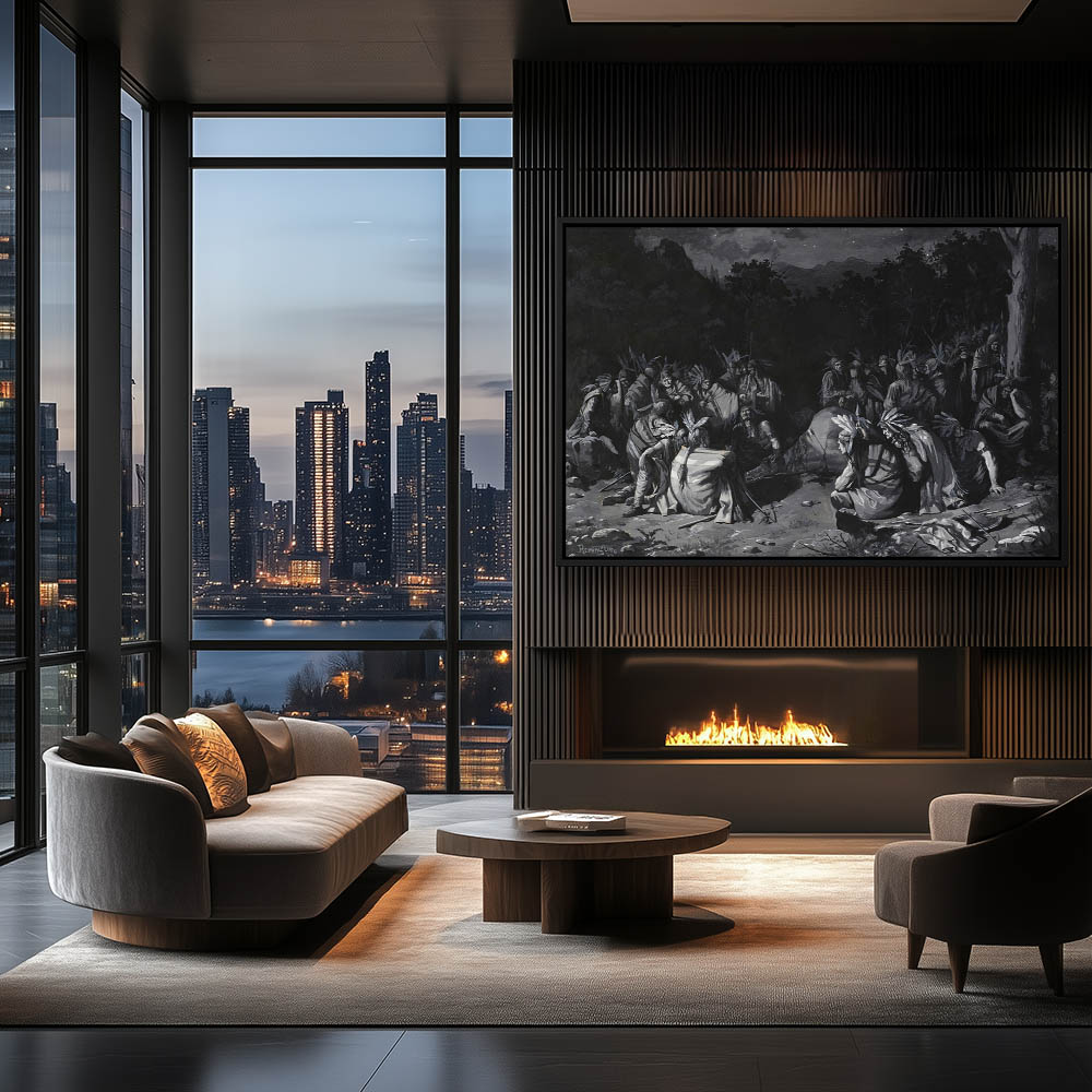 Indian lookout on horseback in a snowy winter landscape inspecting figures on the horizon