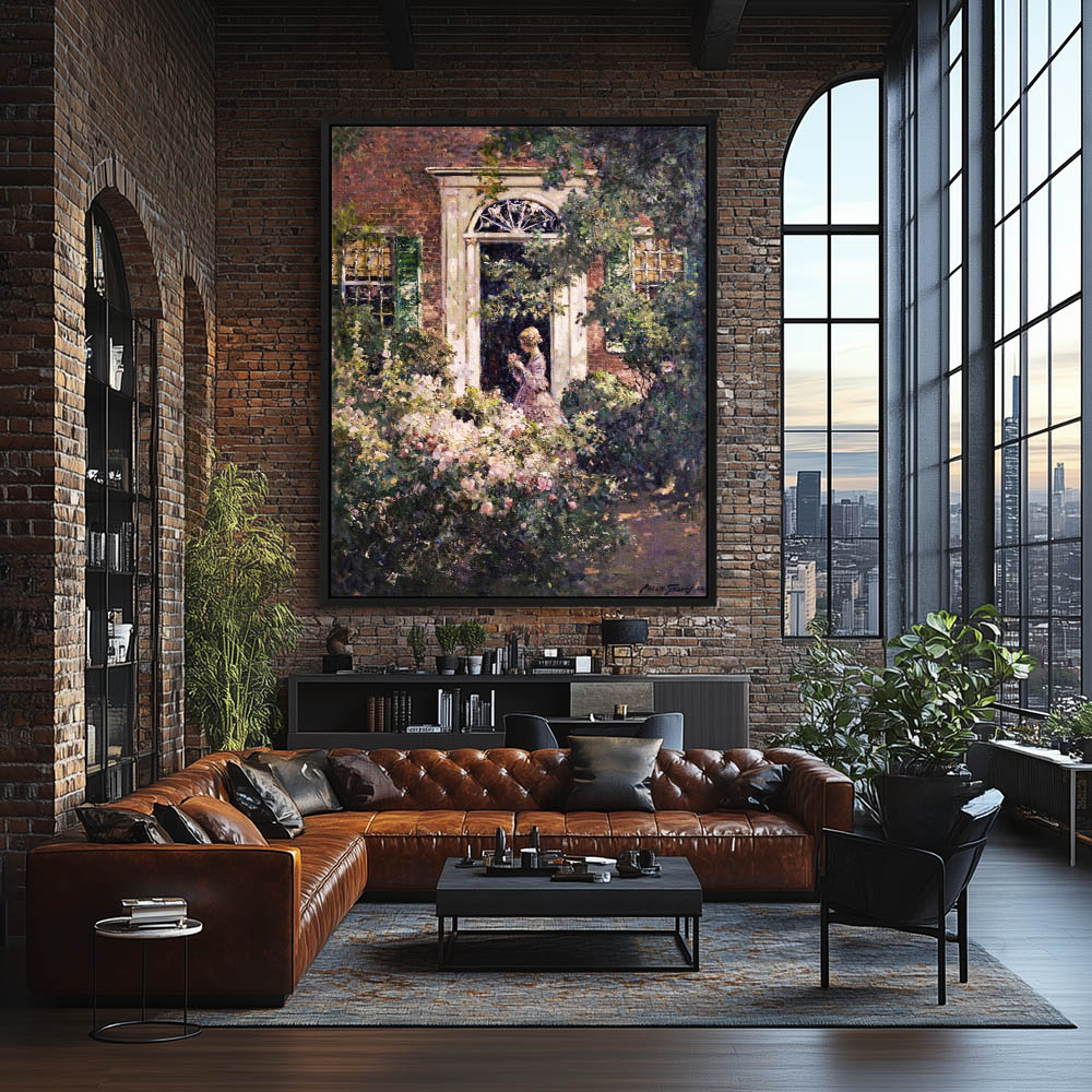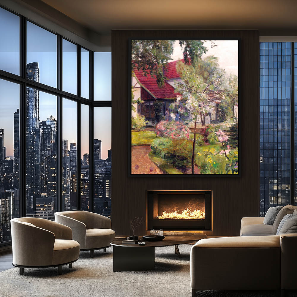 Vintage Landscape Painting of the Flower Garden with a Doorway