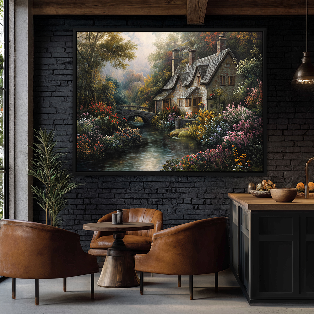 Beautiful Wall Art Painting of a Cottage by a Stream in Spring with Flowers, Home Decor, Stretched Canvas, Vinyl Wall Peel, Poster Art, Fine Art Prints, Metal Wall Art, Framed Prints, Canvas Wall Art Framed in Floater Frames