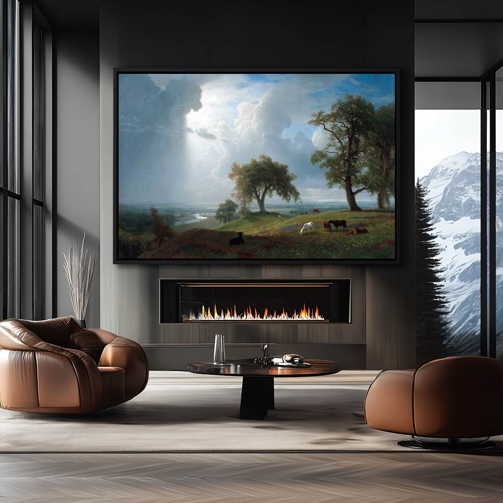 Cattle in a sprinttime wildflower meadow with sunlight breaking through the heavy clouds to glint off the river in the distance